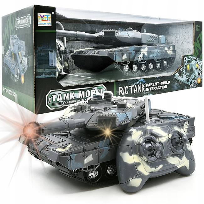 Эта грозного вида боевая машина оснащена световыми и звуковыми эффектами. Транспортное средство передвигается на резиновых колесах, расположенных под гусеницами. Управляем им с помощью пульта, входящего в комплект. Во время движения включаются установленные на броне фонари, слышны звуки выстрелов боеприпасов и т. д. Его башня вращается на 360°, а ствол отклоняется. Танк удивительно быстр и маневрен.