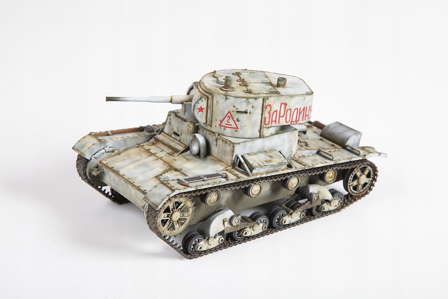 Т-26 — советский лёгкий танк выпуска 1931-1941 годов. Выпущено множество модификаций. Для своего времени танк имел хорошую броневую защиту и мощную 45-мм пушку. пушка. Т-26 принимал участие во всех конфликтах своего времени: в Гражданской войне в Испании, в конфликтах на Халхин-Голе и в районе озера Хасан, принимал непосредственное участие в Зимней войне и, конечно же, в Великой Отечественной войне. Но путь боевой машины после окончания выпуска не закончился, Т-26 также принял участие в советском наступлении на Японию. Танкисты любили неприхотливую машину, умело на ней могли воевать, однако слабая лобовая броня, бензиновый двигатель и устаревшая к началу Великой Отечественной войны пушка сделали танк непригодным для боевых действий, поэтому до августа 1941 года он использовался только как танк поддержки пехоты. Набор пластиковых деталей для сборки одной модели танка.