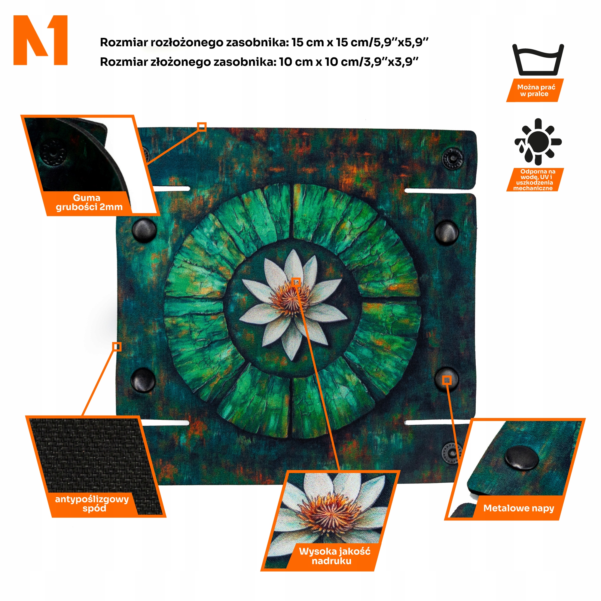 С одной стороны, спокойная поверхность воды с распространенным листом, с другой -красивой цветок лилии, символ баланса, мира и ... идеального порядка в компонентах. Вы можете адаптировать климат подноса к нынешней вечеринке, более темная версия с листом идеально подходит для более темных миров, а цветущая лилия будет работать в играх, встроенных в волшебную среду.