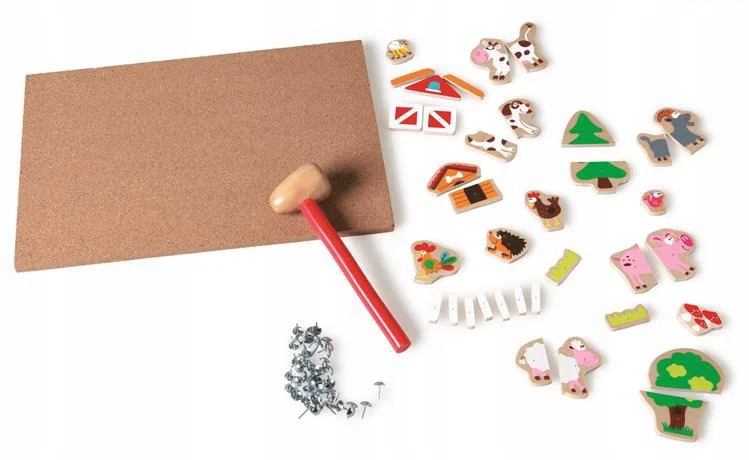 Нажмите — нажмите Scratch Farm Nailer. Пробковая доска с деревянными элементами, которую ребенок может прикрепить с помощью маленьких гвоздей и деревянного молотка, — это вариант известной и популярной классической игры в забивание гвоздей. Только от фантазии ребенка зависит, как будет выглядеть его ферма с животными. Вы можете поместить животных в загон, и собака будет охранять ферму.