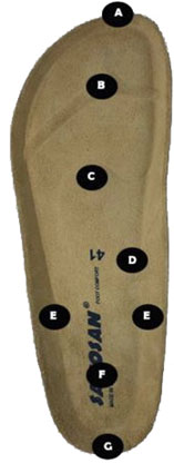 <р>Э. Поддержка продольного и поперечного свода стопы: стабилизирует пятку <р>Ф. Выемка в области пятки: обеспечивает надежную поддержкуГ. Подошвы из пробки и пеноматериала: чрезвычайно гибкие, оптимальные комфорт и форма