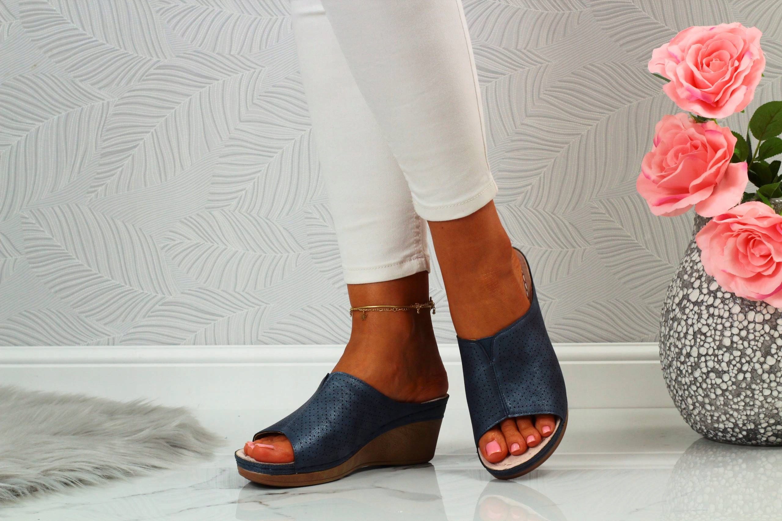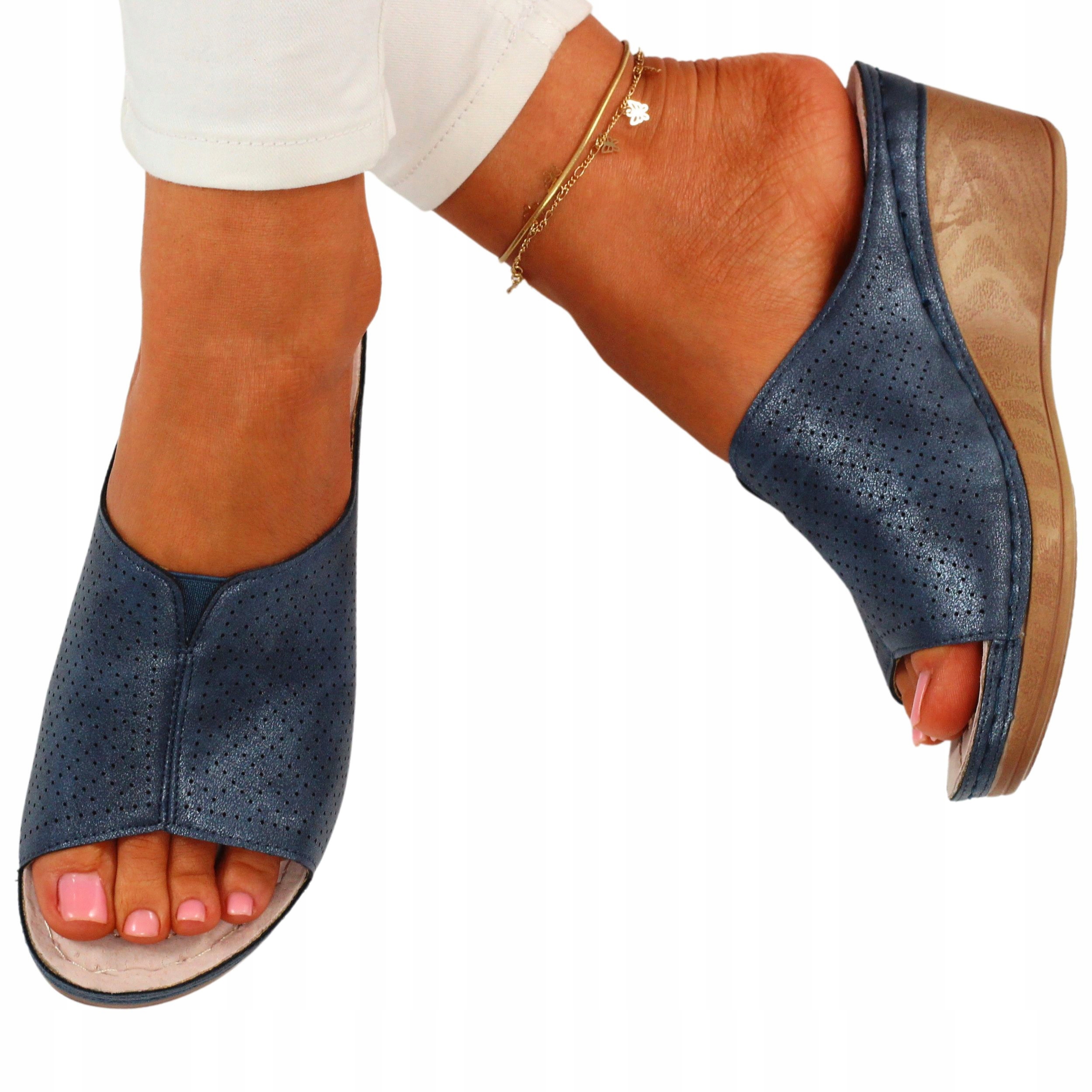 Женские темно-синие босоножки на танкетке. Они идеальны в качестве повседневной обуви в жаркие летние дни. Профилированная кожаная стелька обеспечивает комфорт использования, а прошитая подошва повышает долговечность обуви.