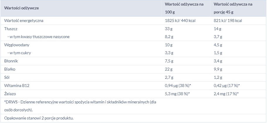 Composition: grain (sunflower 21 %, linseed 7 %, chia seeds 2 %), 19 %soy protein, water, rapeseed oil, dried onion, coconut vegetable fat, starch, salt, spices, shea vegetable fat, sugar, gluten -free wheat fiber, spice extracts, aromas, aromas, aromas, aromas, aromas, aromas, aromas, aromas Red beetroot powder (0,2 %), антиоксидант: аскорбат натрия, железо, витамин В12, столовая - гелевое вещество: альгинат натрия, стабилизаторы: целлюлоза, хлорид кальция