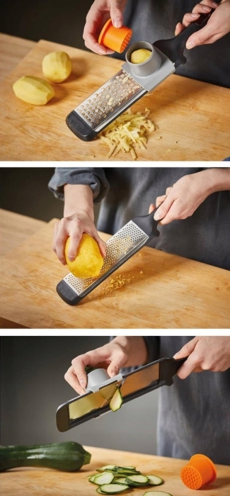 Отличное средство для натирания крупной терки, идеально подходящее для измельчения овощей, фруктов и сыра. Защита пальцев обеспечивает безопасное использование. Уникальный дизайн позволяет легко чистить даже в ограниченном пространстве. Можно мыть в посудомоечной машине.
