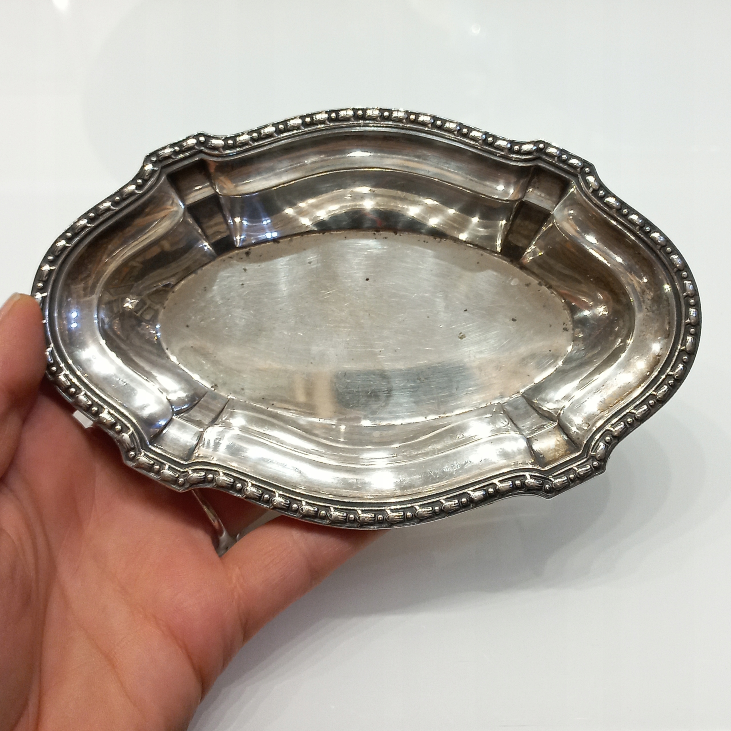 Предмет продажи небольшая серебряная пиала-подставка для торта, украшенная нежным декоративным орнаментом.