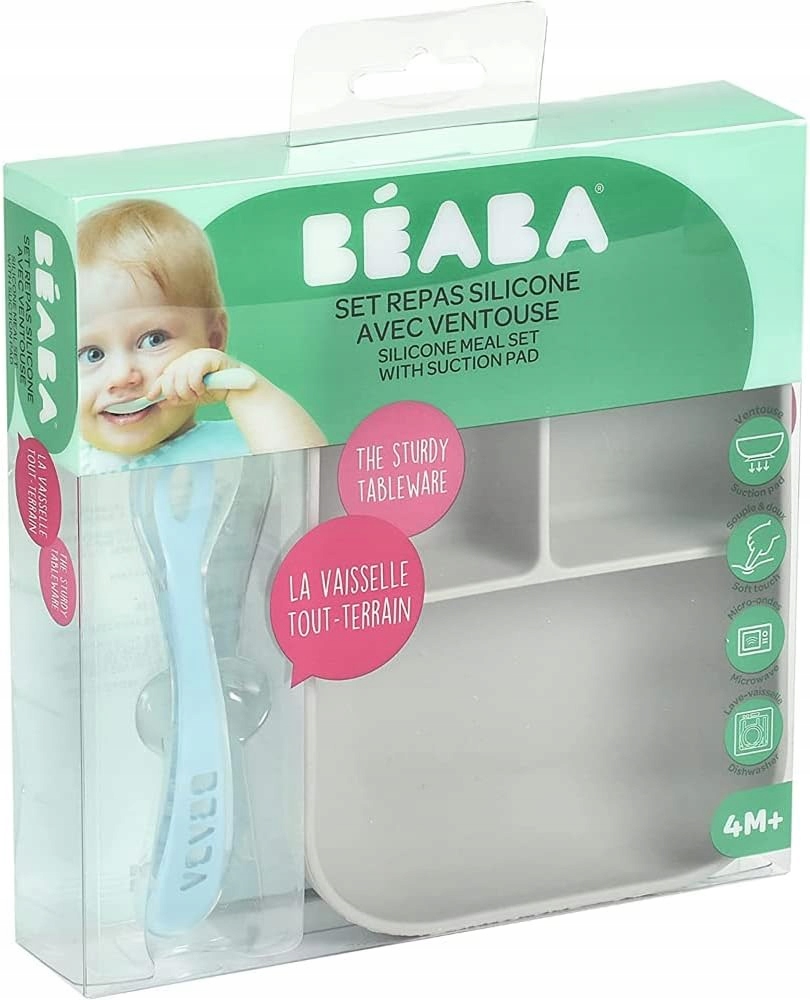 BéABA, набор для детского питания, с присоской, противоскользящий, силиконовая тарелка + ложка, здоровый и прочный, можно мыть в посудомоечной машине, можно использовать в микроволновой печи, можно замораживать, легко ухаживать, серый