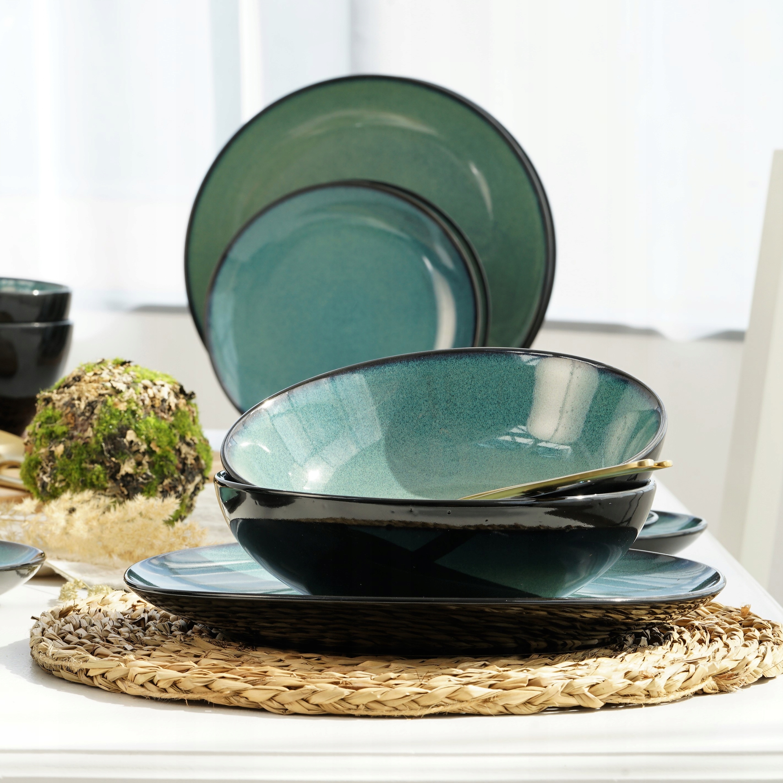 Десертная тарелка из коллекции «Морской». Эта линия отличается интересной расцветкой. Дно тарелок и блюдец черное, а их поверхности покрыты реактивной глазурью зеленого и синего оттенков. Преобладание одного из этих оттенков приводит к минимальным цветовым различиям между блюдами.