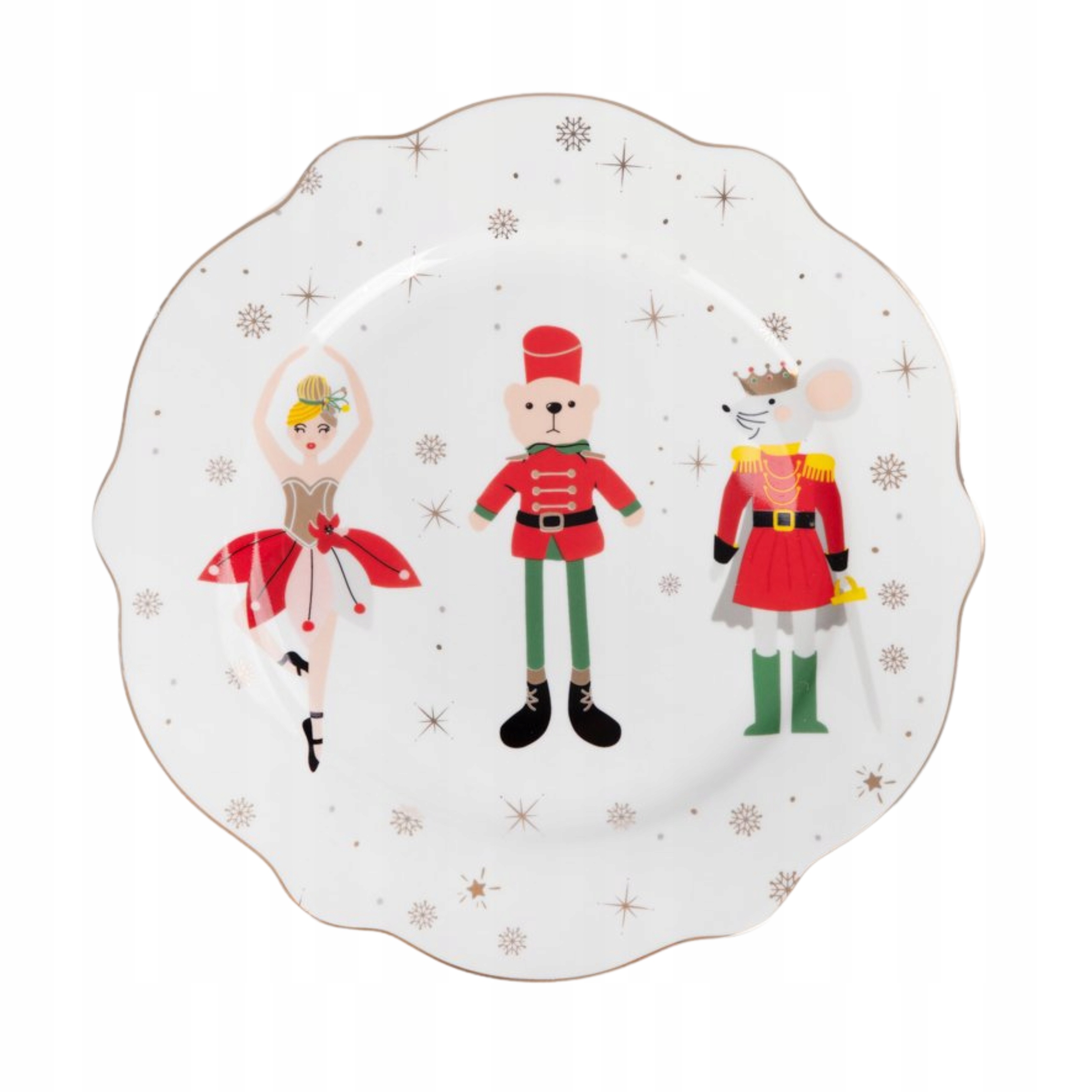 Привнесите волшебство праздника в свою столовую с десертной тарелкой LICOLA. Вдохновленная классическим балетом, тарелка восхищает очаровательными фигурками балерины, щелкунчика и мышиного короля, что придает ей неповторимый характер. Мелкие золотистые детали и волнистый край придают неповторимый вид каждому торту или десерту.