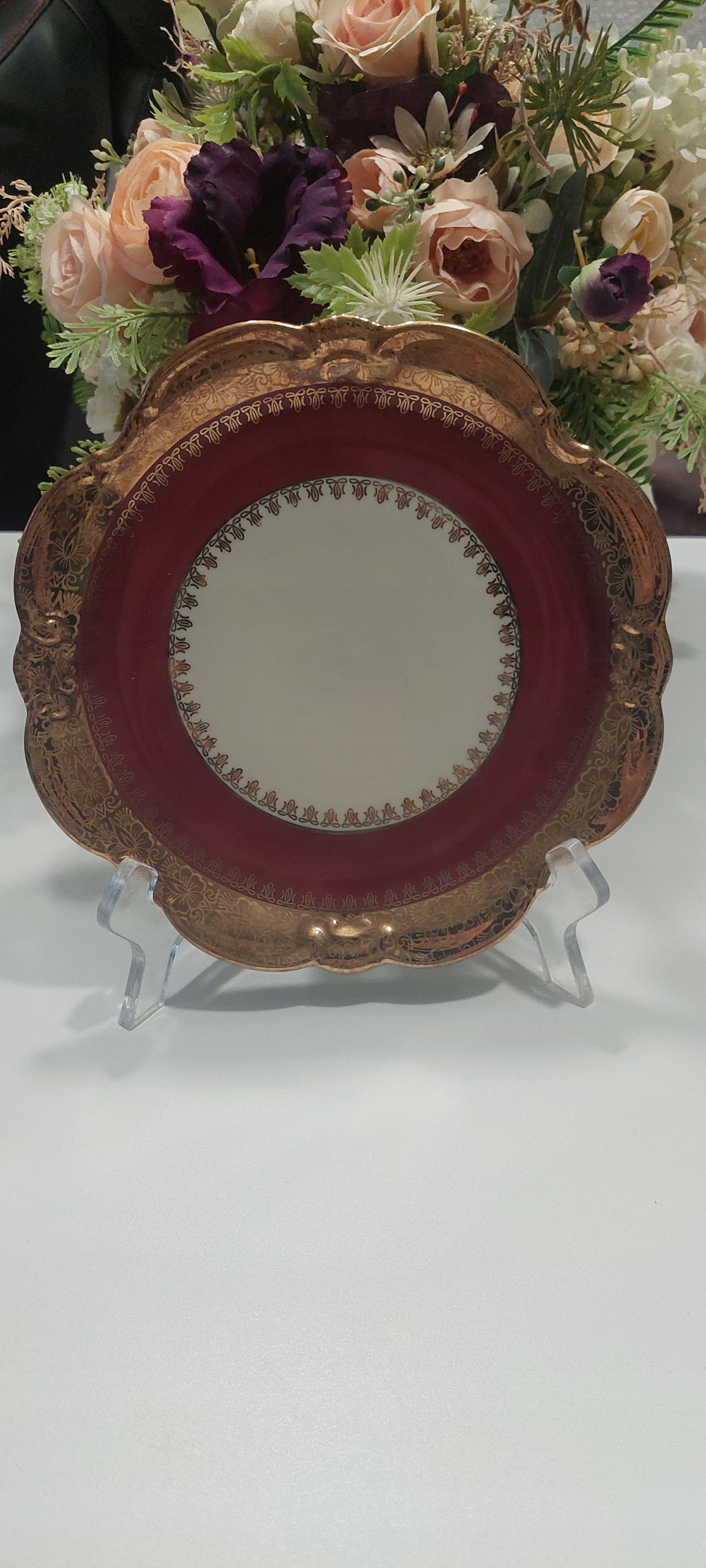 Тарелка диаметром 19,5см. На пластине имеются минимальные царапины, видимые на фотографиях на бордовой части.