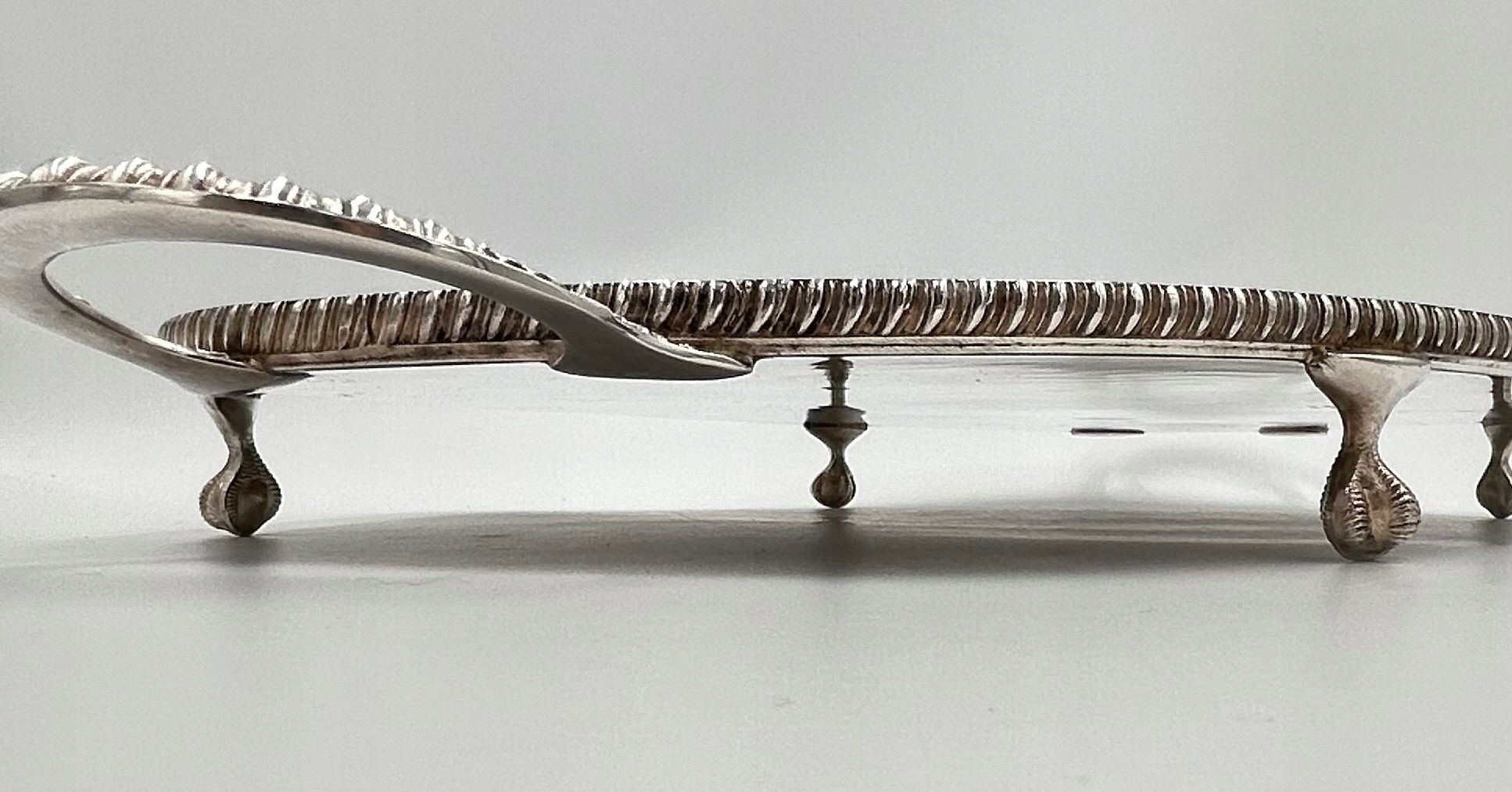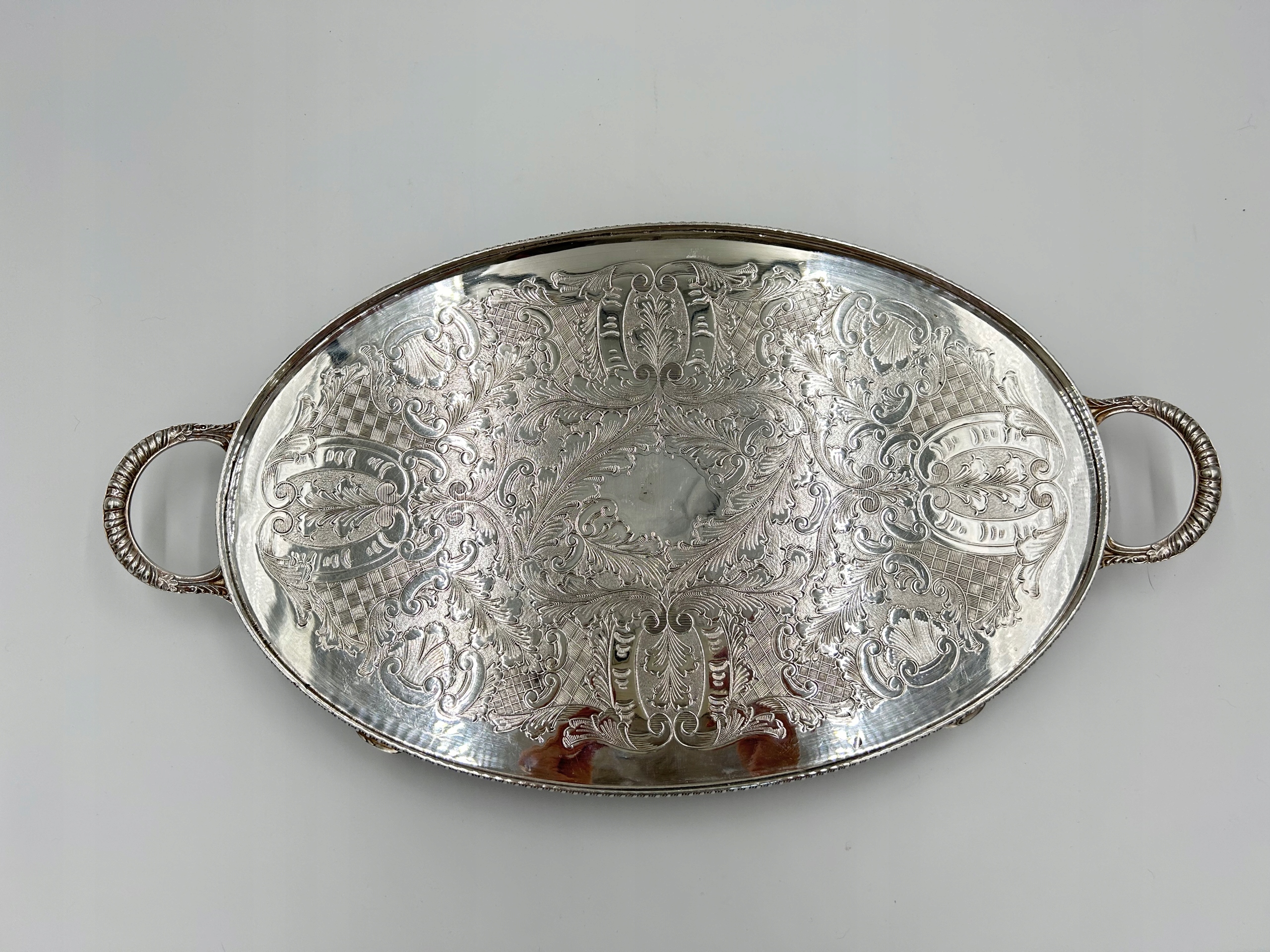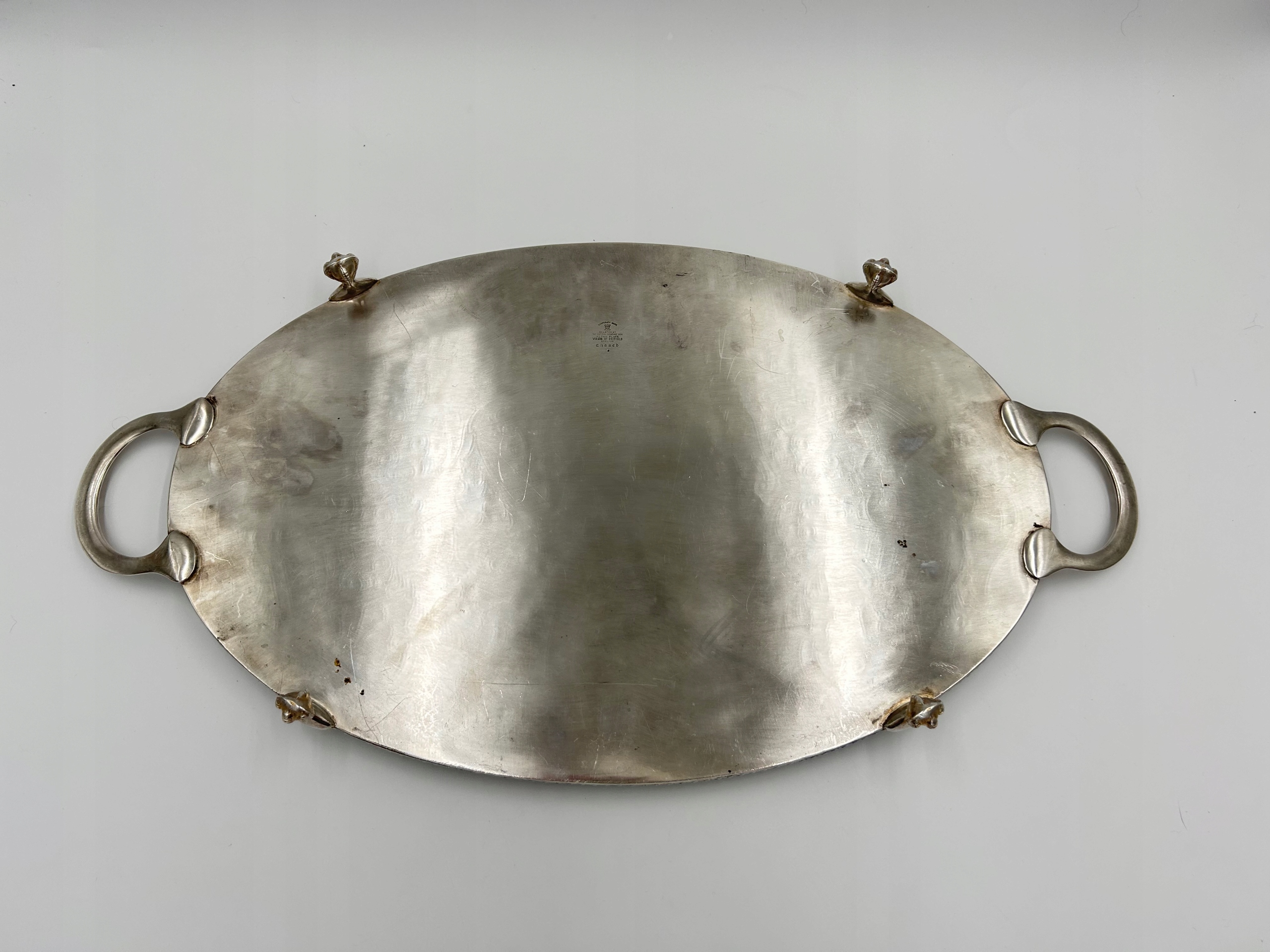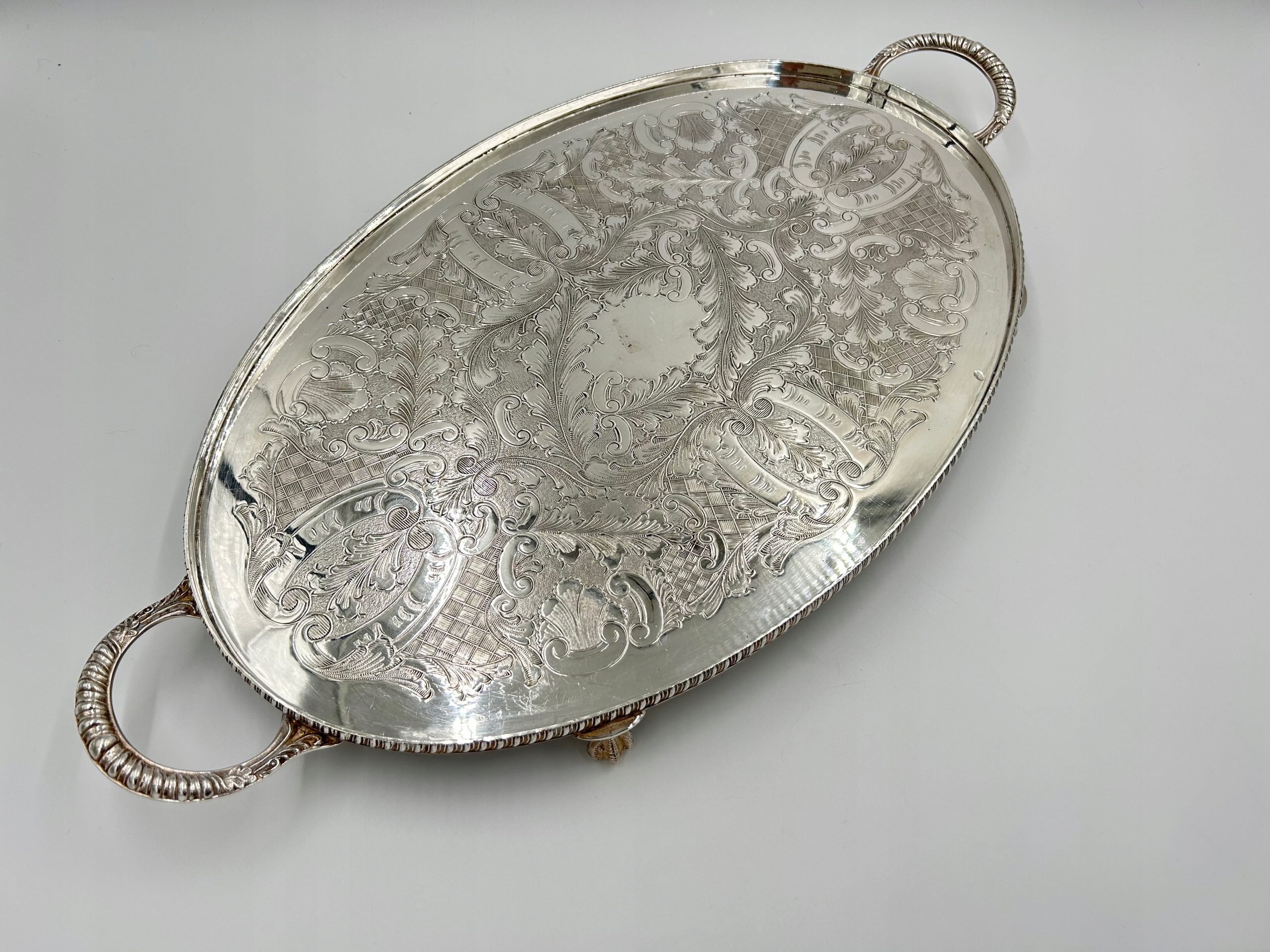Предмет продажи – уникальное блюдо, красиво оформленный поднос. Блюдо овальной формы с декоративными ручками, установленное на четырех изящно изогнутых ножках. Подпись находится на обратной стороне пластины. Происхождение: Англия.