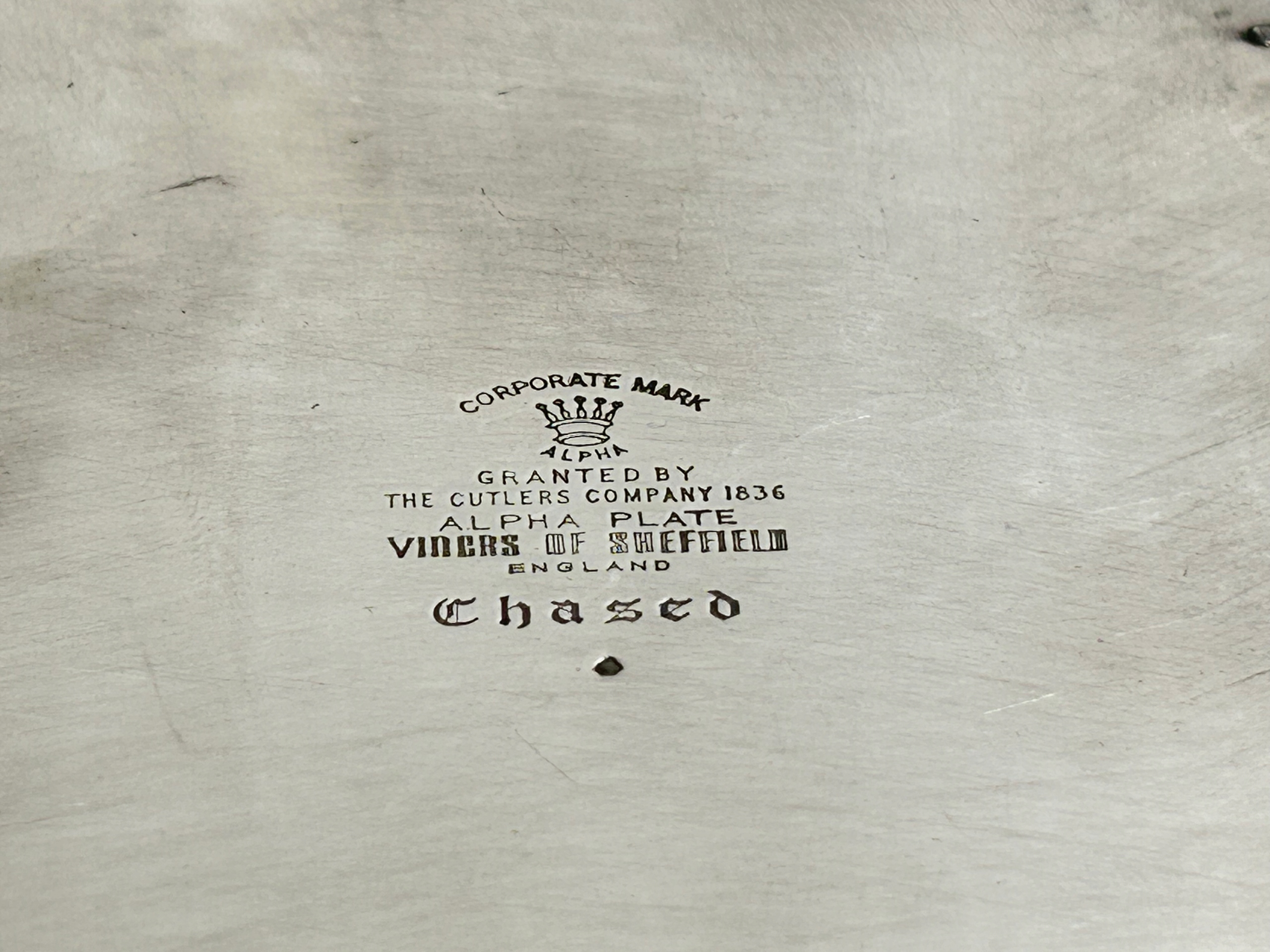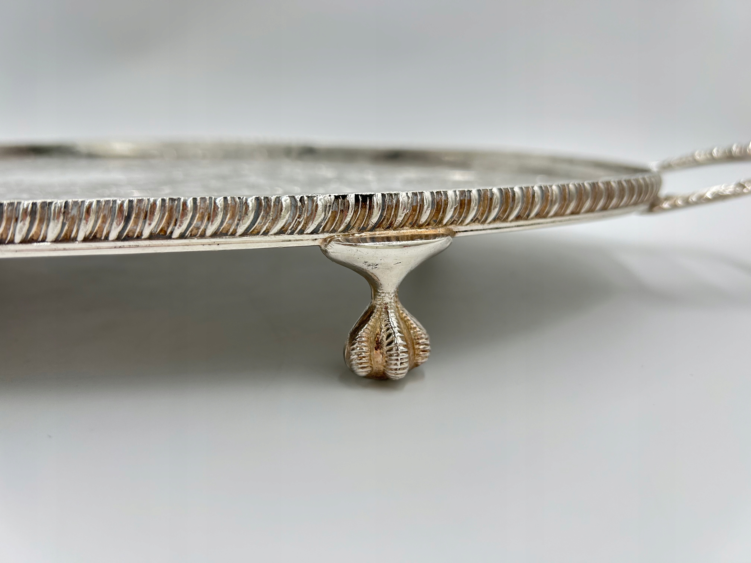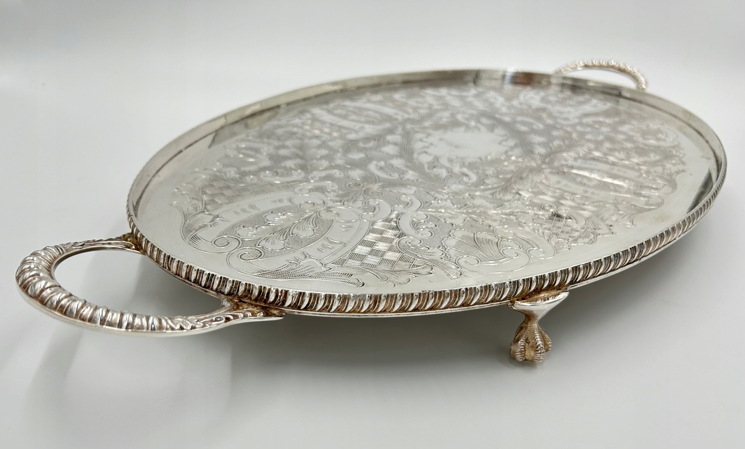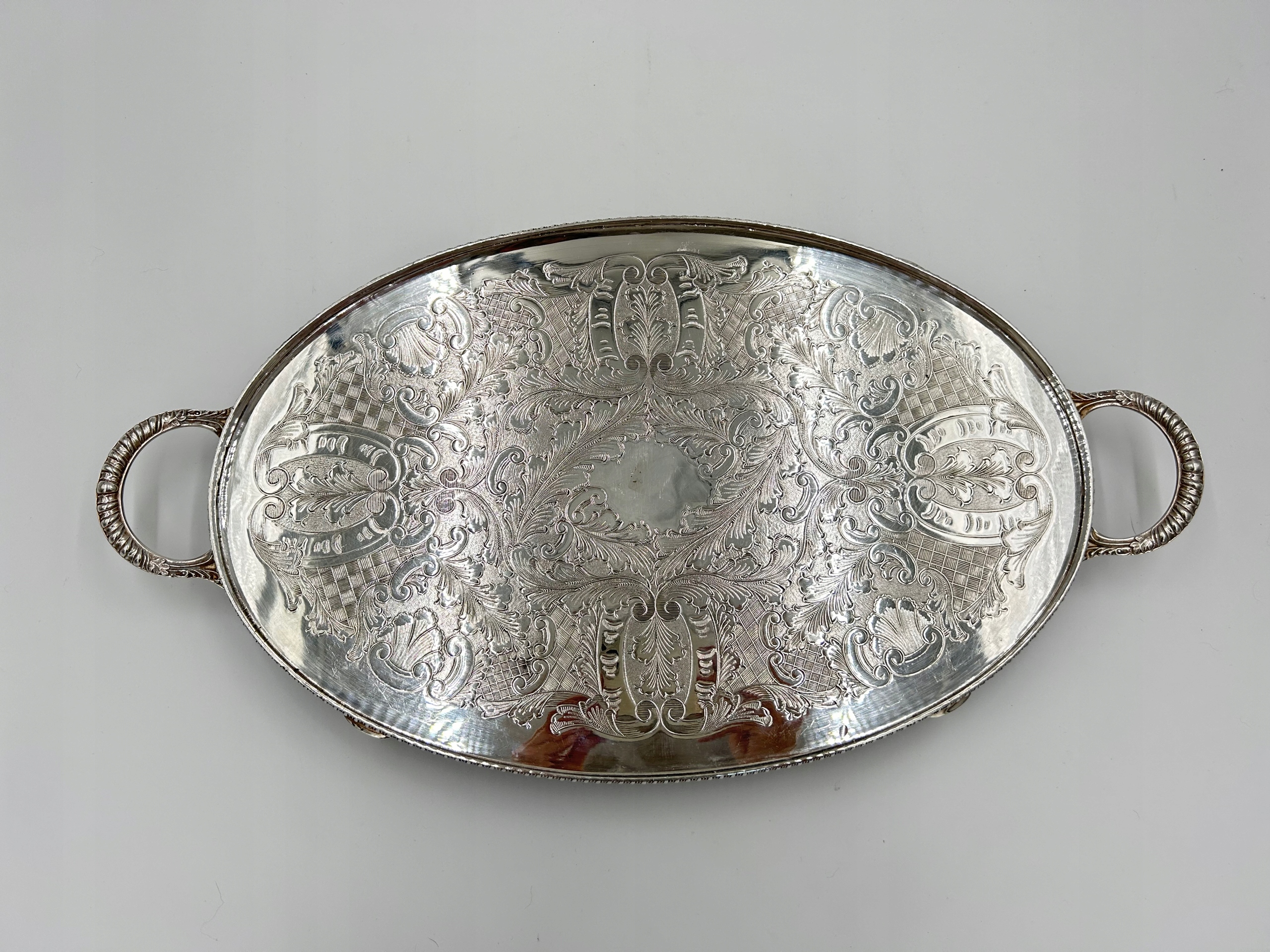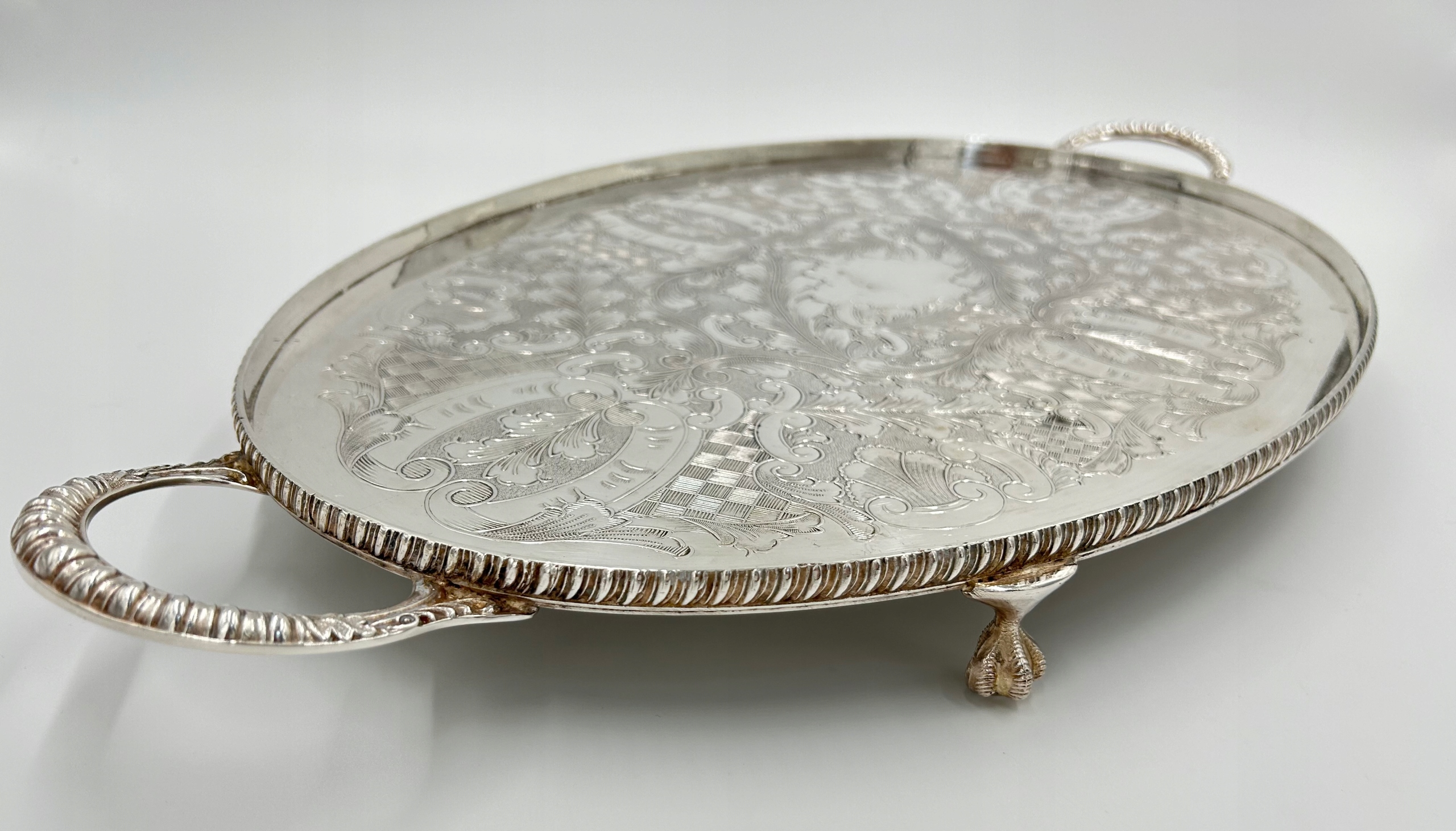 Предмет продажи – уникальное блюдо, красиво оформленный поднос. Блюдо овальной формы с декоративными ручками, установленное на четырех изящно изогнутых ножках. Подпись находится на обратной стороне пластины. Происхождение: Англия.