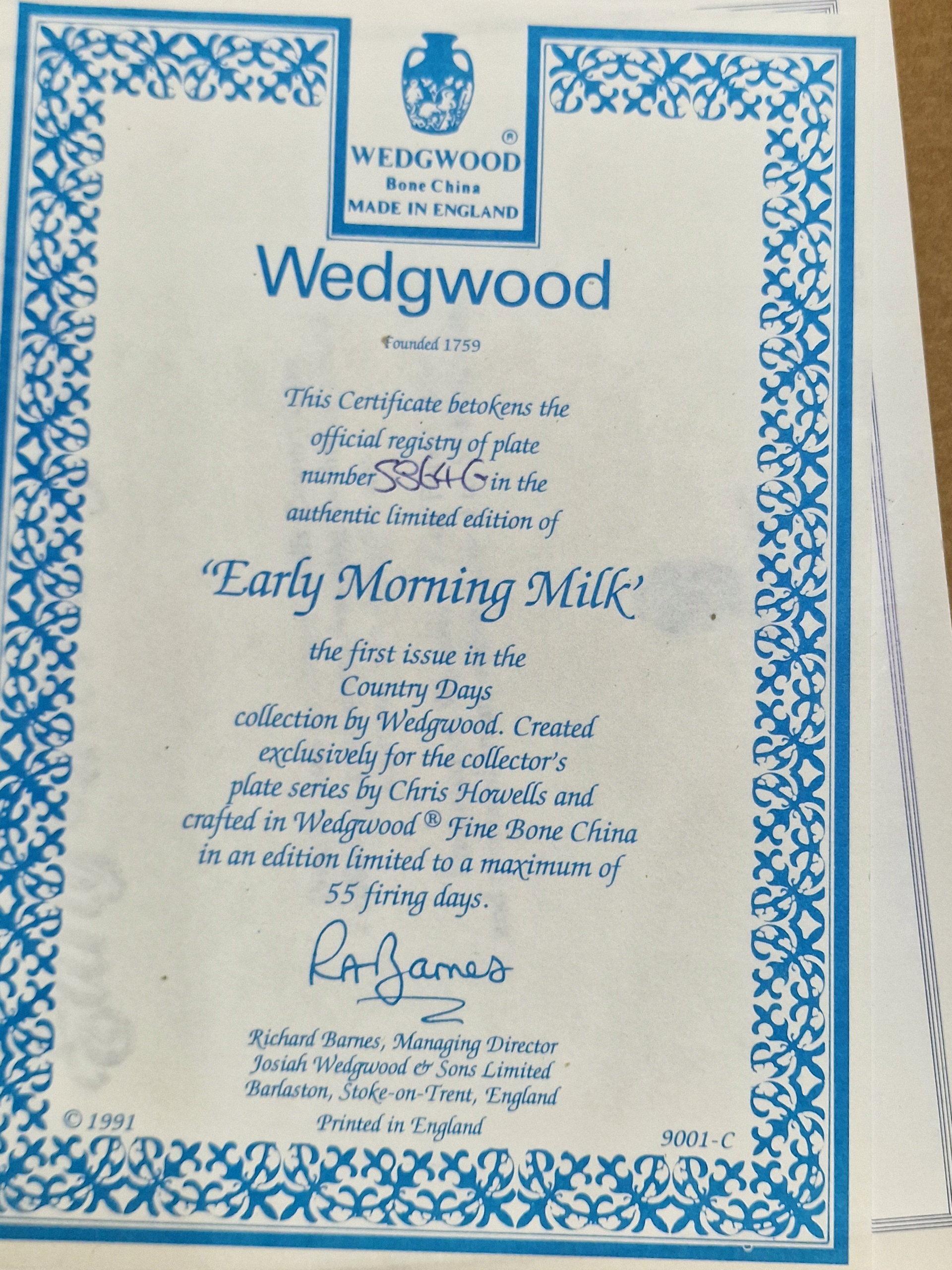 Сертификат коллекционера тарелки Wedgwood.