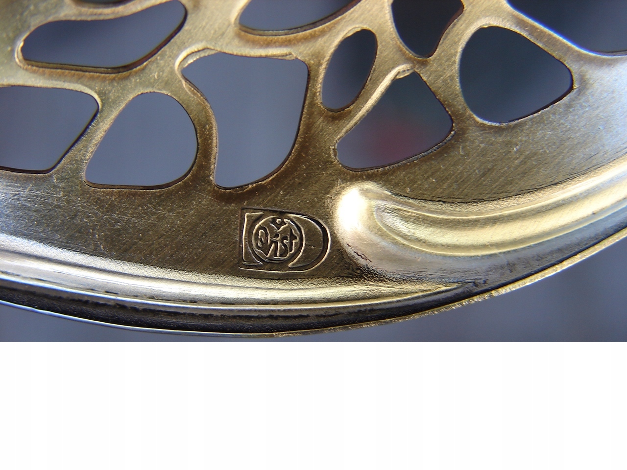 Фруктовое сервировочное блюдо, покрытое плакировкой, украшенное волнистой ажурной формой, опирающееся на три сферические ножки.