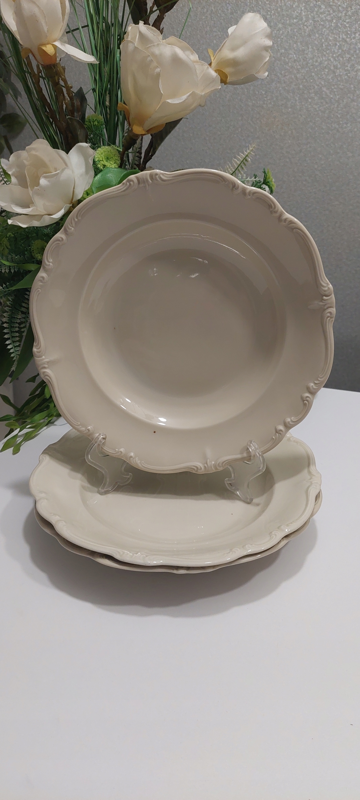 Три тарелки ROSENTHAL Pompadour, цвет слоновой кости, размеры: высота 4 см, диаметр 25 см. На двух пластинах есть по одной точке, видно на фотографиях.