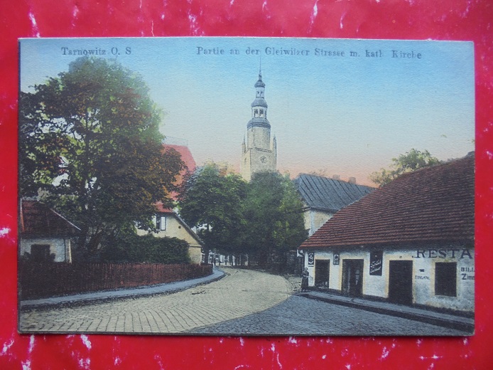 TARNOWSKIE GÓRY TARNOWITZ PARTIE AN DER GLEIWITZER STRASSE MIT KATH. РЕСТОРАН КИРХЕ БЕЗ ОБРАЩЕНИЯ, СОСТОЯНИЕ НА ФОТО, КРАСИВАЯ ОТКРЫТКА ИЗ ЭПОХИ, ВОЗМОЖНОСТЬ ОПЛАТЫ ТРАДИЦИОННЫМ ПЕРЕВОДОМ ING BANK SLĄSKI