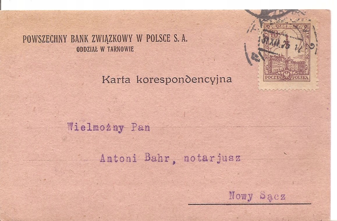 TARNÓW-POWSZECHNY BANK ZWIĄZKOWY -KARTA -1925 rok