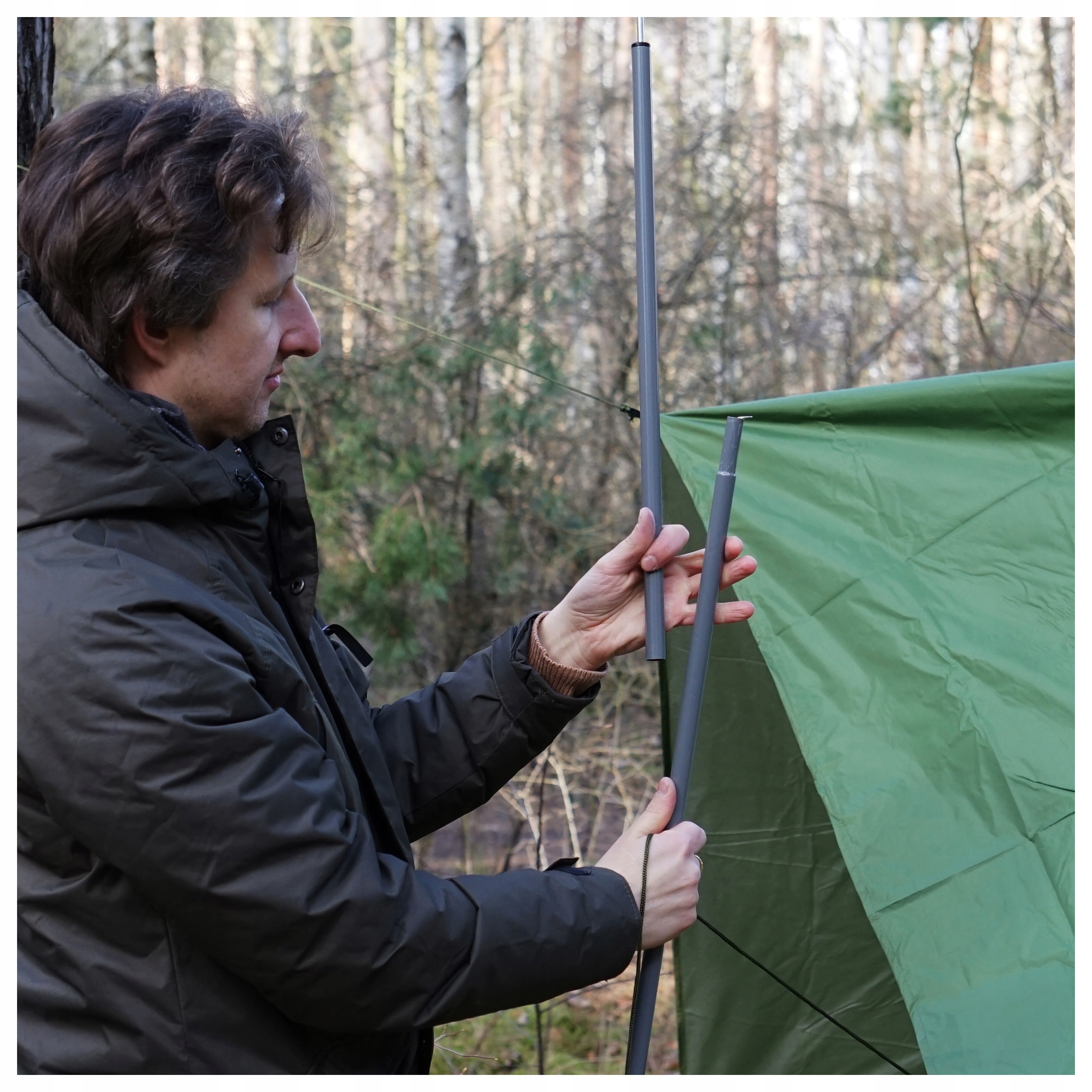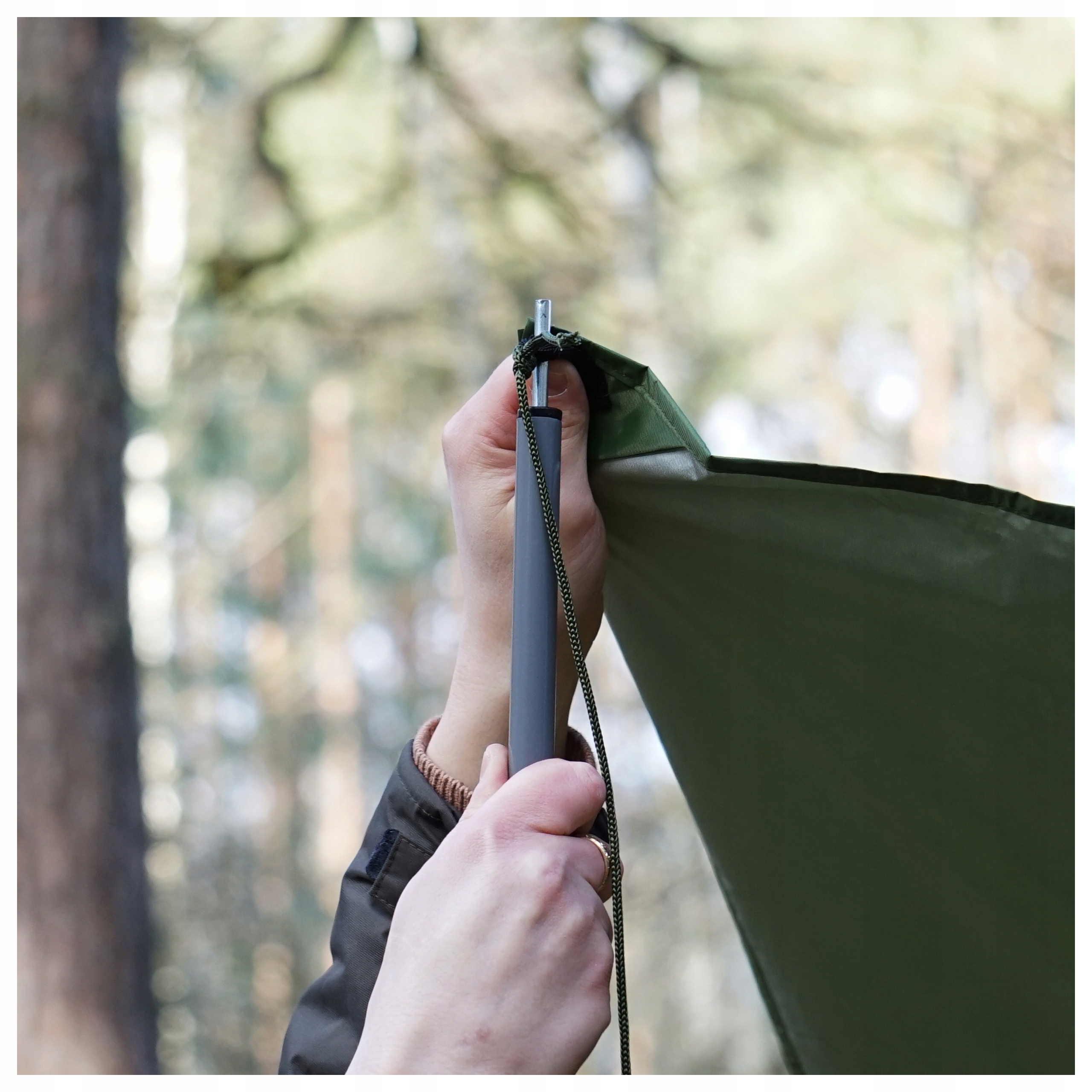 Тент для бивуака можно собрать разными способами. Петли устроены так, чтобы лист можно было расправить как угодно. Из брезента можно сделать палатку, крышу над гамаком, стену, защищающую от порывов ветра или дающую тень от жаркого солнца, накрытие для импровизированного душа, коврик для пикника и даже спасательные носилки. .