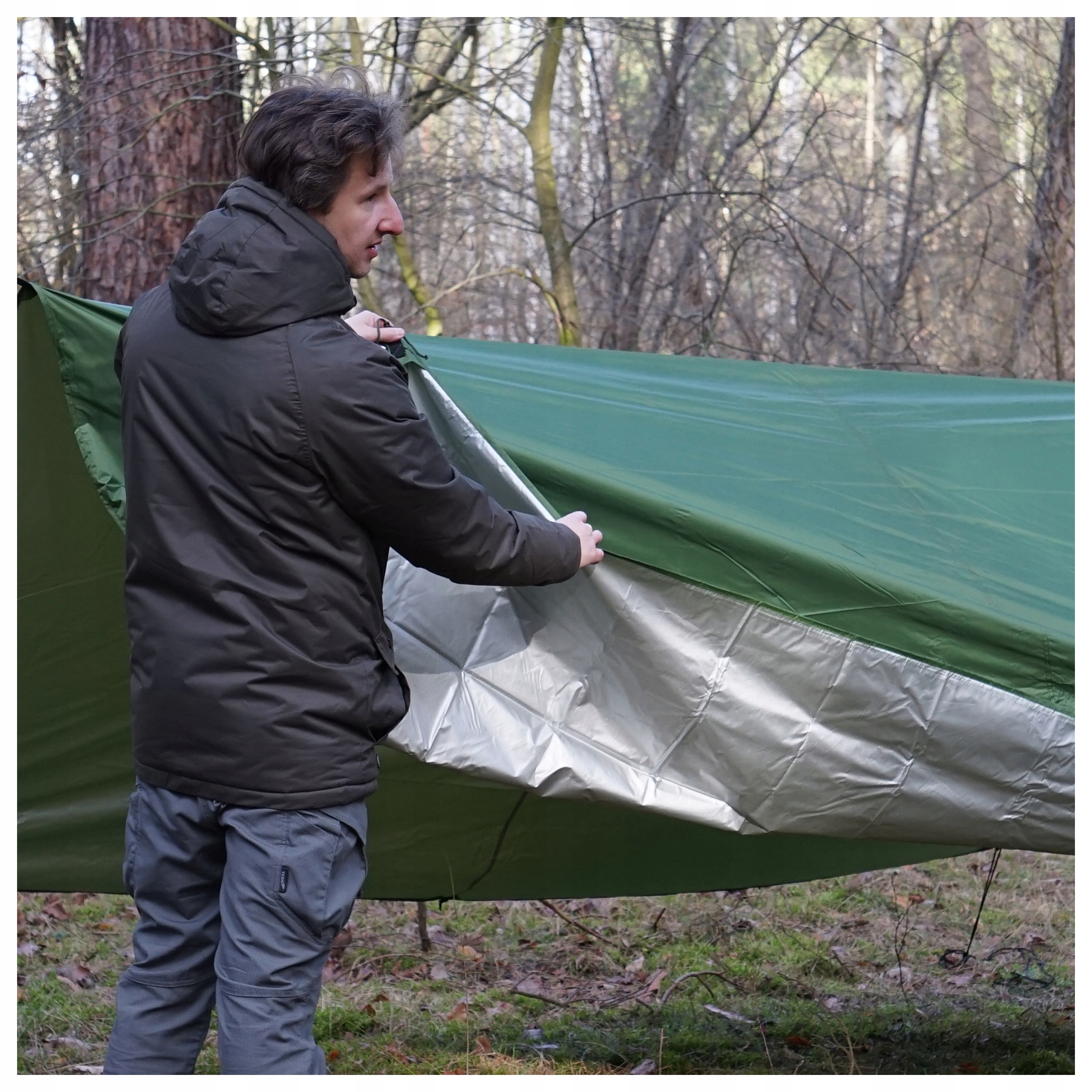 TARP — это водостойкий, солнцезащитный брезент для кемпинга с теплоизоляционным слоем серебристого цвета, который обеспечивает превосходную водонепроницаемость. , прокол или разрыв. Лист изготовлен из легкого, компактного, дышащего нейлонового материала (полиэстер 210T). Брезент можно успешно использовать в неблагоприятных погодных условиях, обеспечивая стойкость к УФ-излучению или защищая от порывистого ветра и дождя или снега. Верхняя сторона оливкового цвета обеспечивает хорошую маскировку.