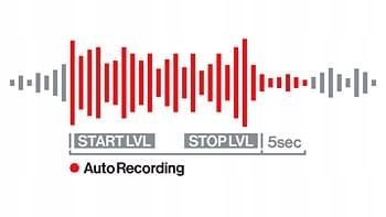 Функция автоматической рецензии (автоматическая запись) может обнаружить уровень входного звукового сигнала и автоматически начать запись. И функция предварительной записи (предварительная запись) обеспечивает надежную защиту, захватывая звук до двух секунд, прежде чем нажать кнопку записи.