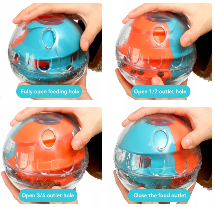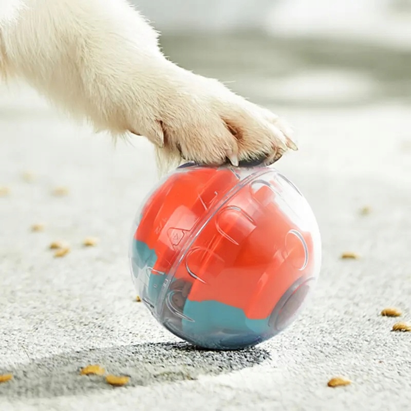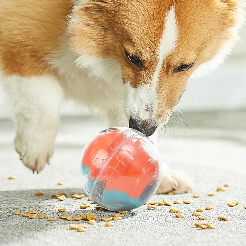 - внутри шара находится лабиринт. Мы кладем в мяч лакомство или корм для собак и даем собаке поиграть. Его задача — доставать лакомства (сухой корм может выпадать через отверстия).