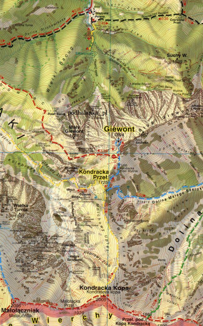На первой карте показана территория Косцелиской долины и Хохоловской долины. На карте очень точно показано направление обозначенных туристических маршрутов, а также разделение по сложности, информация об искусственных сооружениях на маршрутах, данные о рекомендуемом направлении движения, а также время прохождения, информация о датах закрытия маршрутов и их зимние маршруты.