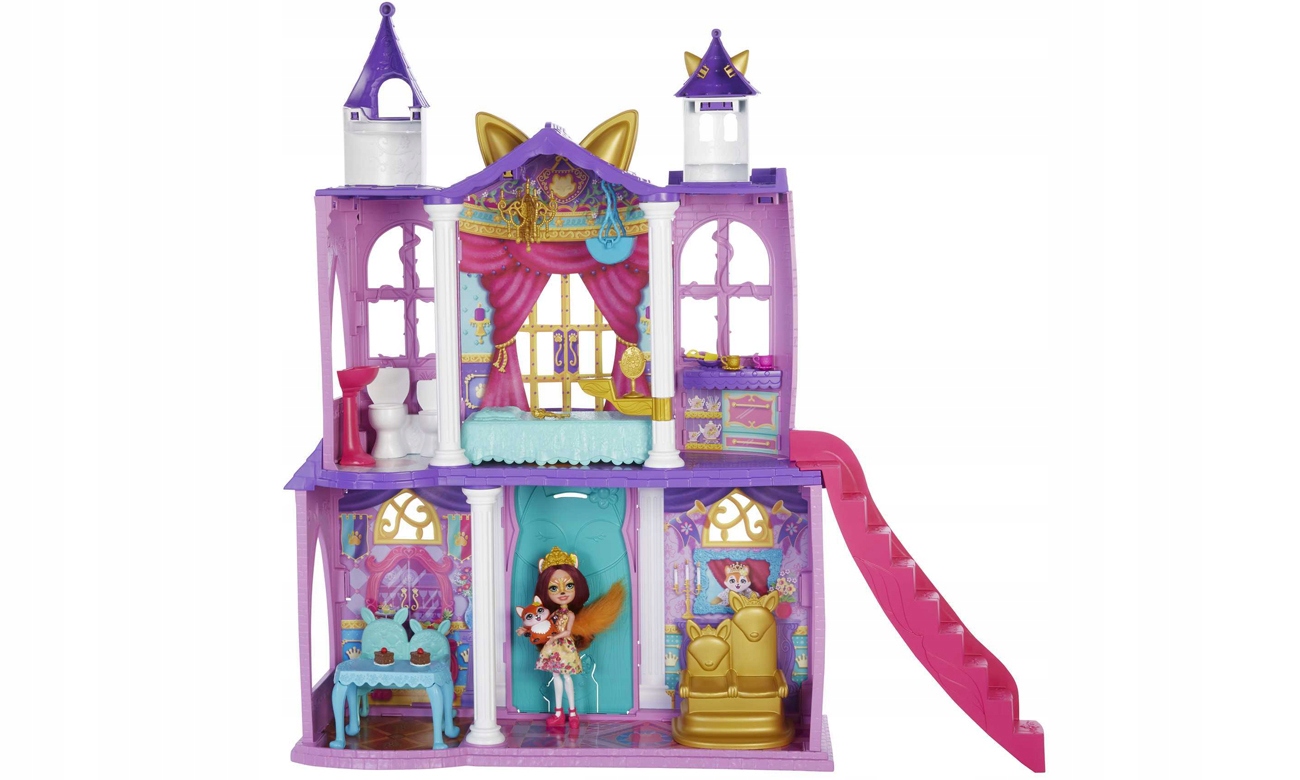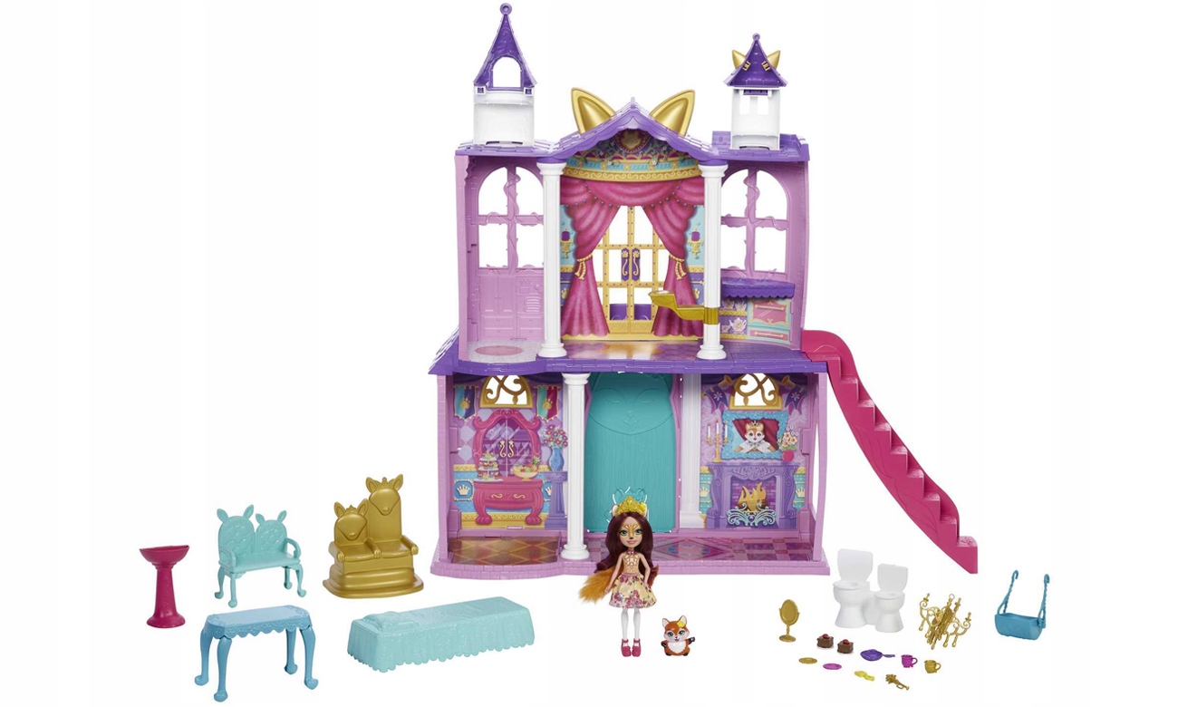 В коробке находятся: Королевский дворец, 15 игровых элементов (например, двойной трон, стол, кровать, тарелки, чашки, зеркало). , модная кукла Фелисити Фокс из Enchantimals и фигурка лисы.