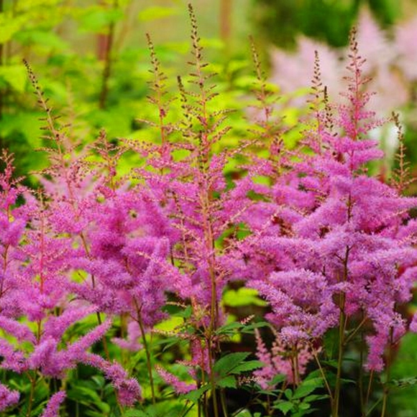 Astilbe x arendsii Astary Rose — многолетнее растение, принадлежащее к семейству камнеломок. Это растение, которое зимой сбрасывает надземную часть, образуя перистые пучки зеленых листьев. Его высокие метельчатые соцветия воздушного розового цвета появляются на рубеже июня и июля. Они чрезвычайно привлекательны и идеально подходят для срезанных цветов. Таволга – многолетник, один из немногих, способных расти в затененных условиях. Поэтому его с успехом можно сажать в местах, где нет дневного солнца.