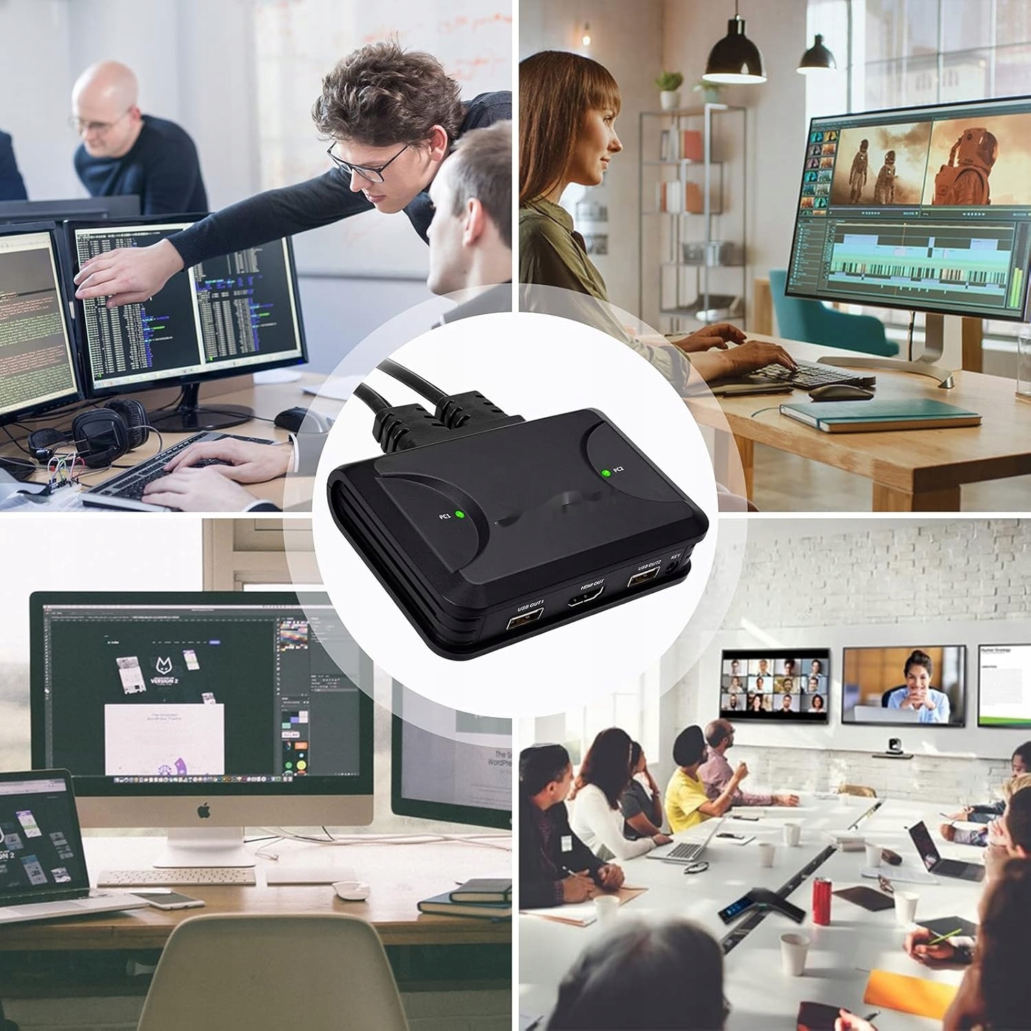 KVM HDMI USB 4K является идеальным решением для людей, которым необходимо управлять двумя компьютерами, используя один набор устройств, включая монитор HDMI, клавиатуру и мышь. Это отличный инструмент для предприятий, офисов, мультимедийных уроков, конференц -залов, игровых комнат, домашних кинотеатров и для исследовательских тестов