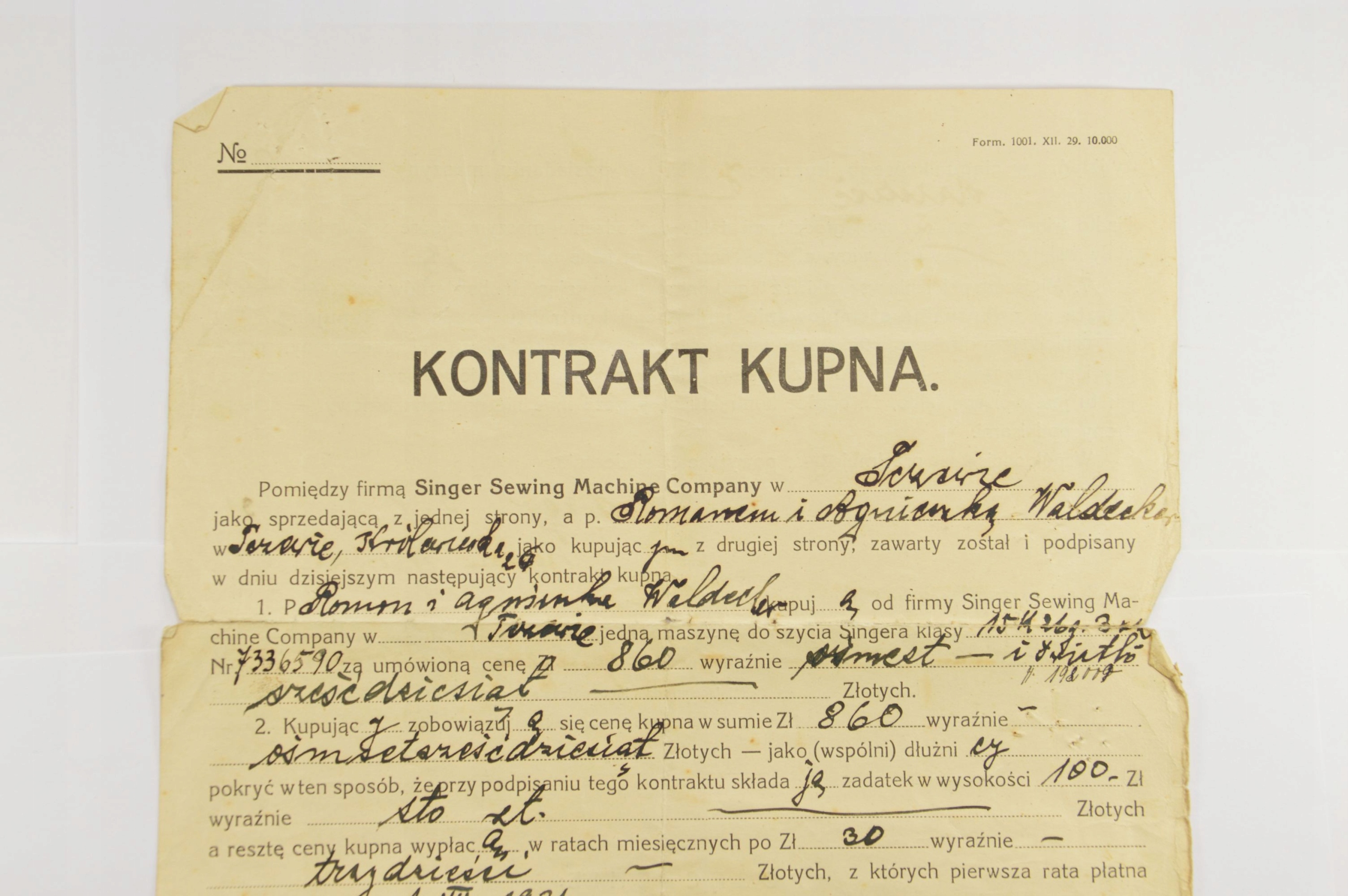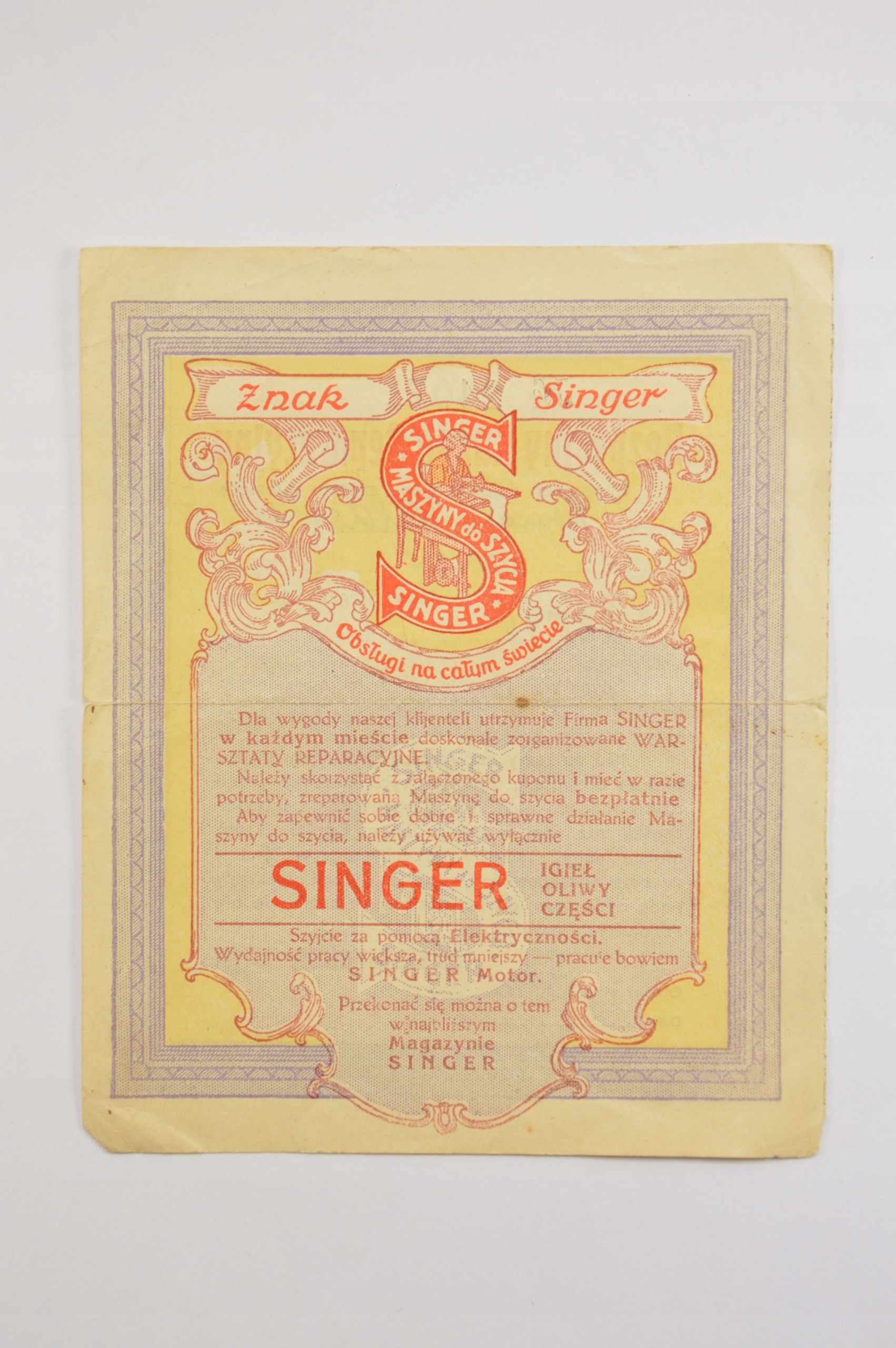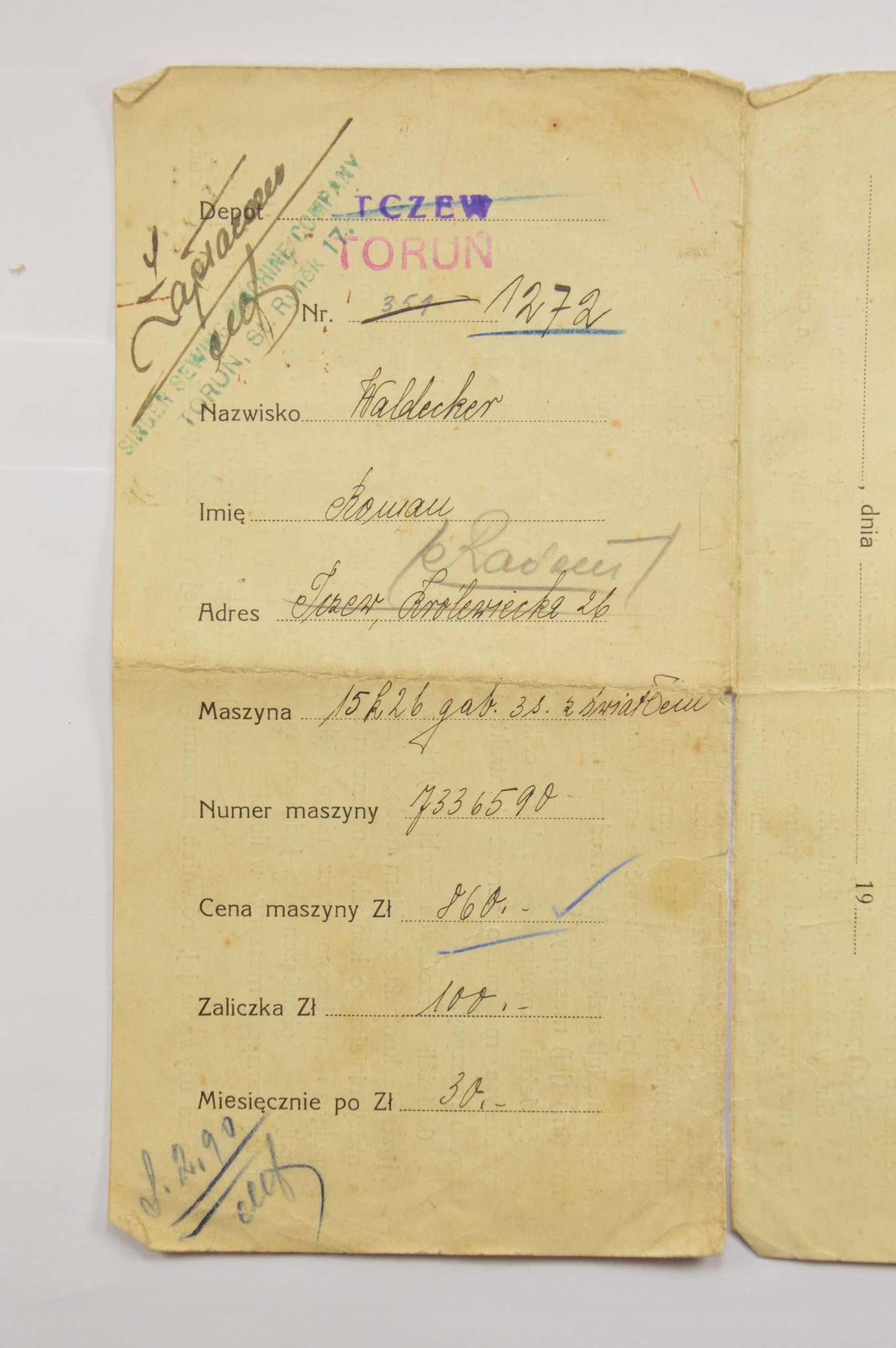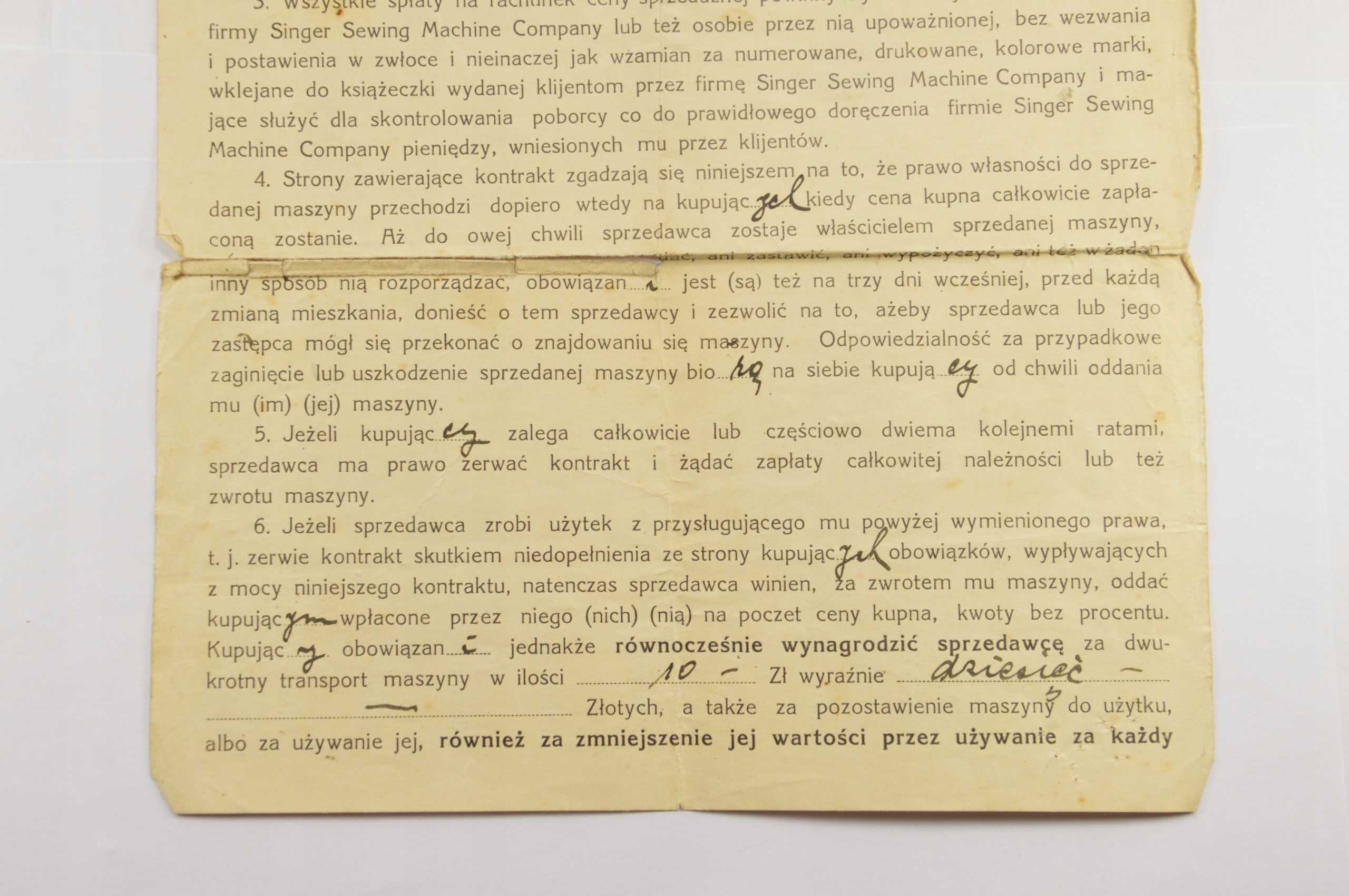 Оригинальные довоенные документы. Договор купли-продажи швейной машины Singer и талон на бесплатный ремонт машины. Документы выданы в Тчеве в 1931 году, номера устройств совпадают в обоих документах.