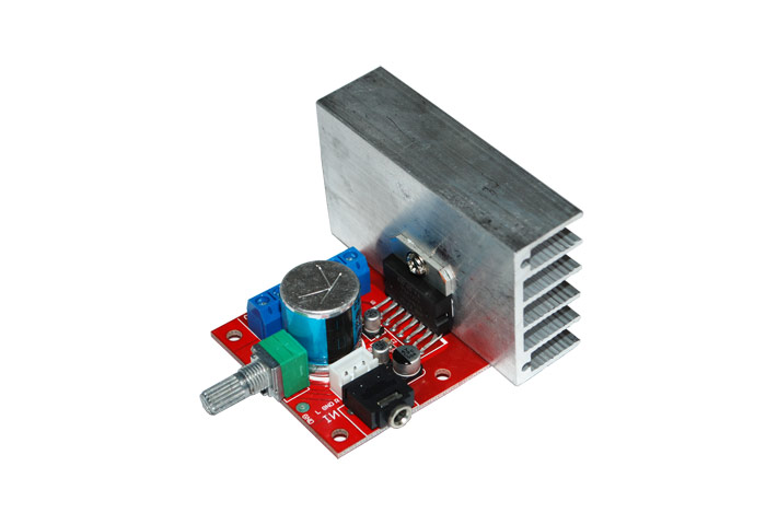 Модуль усилителя звука на базе микросхемы TDA7377. Модуль имеет входной разъем, два выхода на динамики и разъем питания. Регулировка громкости с помощью поворотного потенциометра.