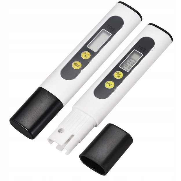Измеритель TDS. Прибор, предназначенный для измерения общего количества любых веществ, растворенных в воде. Диапазон чтения 0-999 частей на миллион. Недорогой, небольшой по размеру, очень легкий и функциональный, оснащен ЖК-дисплеем. В целях экономии заряда батареи счетчик автоматически выключается через 10 минут бездействия.