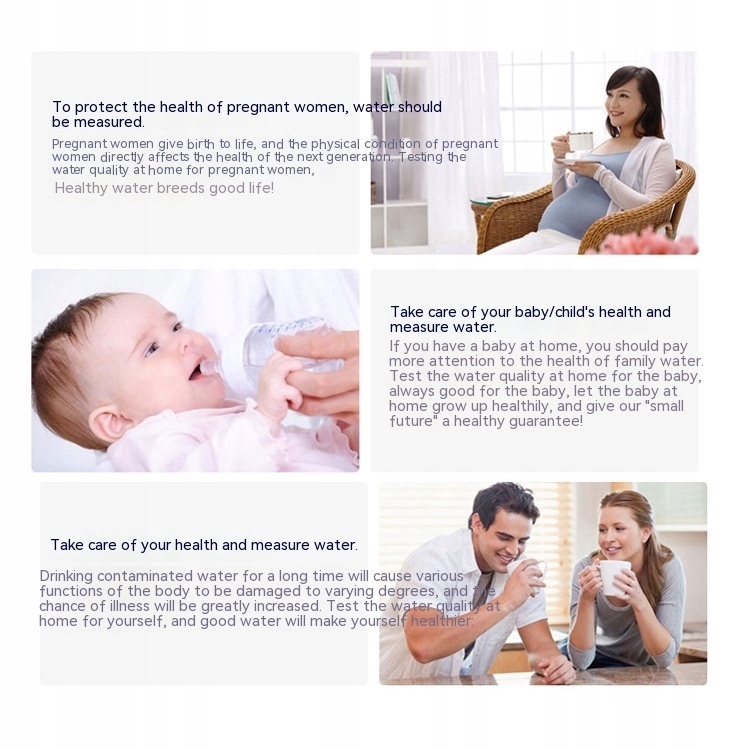Чтобы защитить здоровье беременных, воду следует измерять. Беременные женщины рождают жизнь, и физическое состояние беременных напрямую влияет на здоровье следующего поколения. Тестирование качества воды в домашних условиях для беременных. Здоровая вода порождает хорошую жизнь! Позаботьтесь о здоровье вашего ребенка/ребенка и измеряйте количество воды. Если у вас дома есть ребенок, вам следует уделять больше внимания здоровью семейной воды. Проверьте качество воды дома для ребенка, это всегда полезно для ребенка, пусть он растет здоровым дома и дает нам «маленькое будущее». «Здоровая гарантия! Берегите свое здоровье и измеряйте воду. Употребление загрязненной воды в течение длительного времени приведет к нарушению различных функций организма в той или иной степени, и риск заболеваний значительно возрастет. Проверьте качество воды дома, и хорошая вода сделает вас здоровее