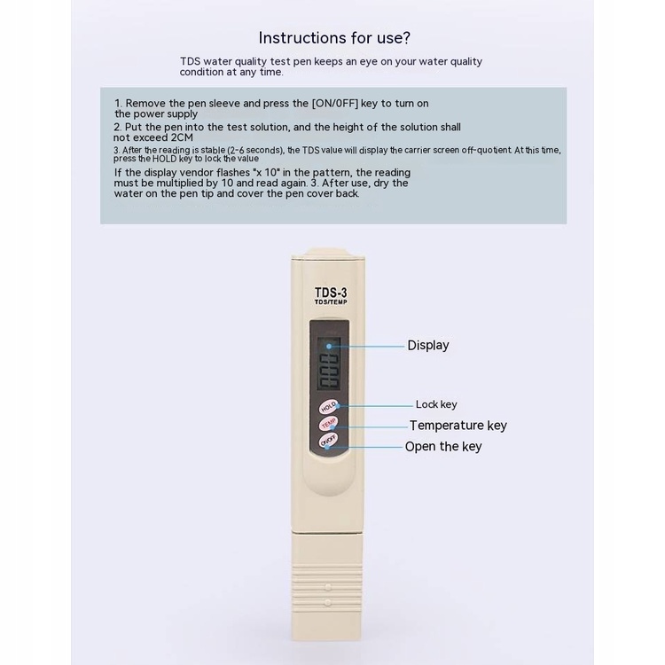 Меры предосторожности Тестер качества воды TDS проверяет состояние качества воды в любое время. 1. Инструмент не может быть водонепроницаемым, не позволяйте жидкости превышать уровень погружения; 2. Приспособление не может быть свободно отрегулировано. Приспособление было исправлено перед отправкой с завода. 3. Если ошибка индикации велика, значение индикации скачет и значение индикации не возвращается к нулю, прибор следует погрузить в линию. Следующие детали погружают в спирт и несколько раз встряхивают для очистки датчика. 4. Если дисплей размыт или не отображается, а погрешность отображаемого значения велика (после очистки электрода спиртом), проверьте это. Проверьте напряжение батареи и своевременно замените батарею, если оно ниже 2,5 В. Чтобы заменить батарею, просто вытащите батарейный отсек и обратите внимание на полярность батареи.