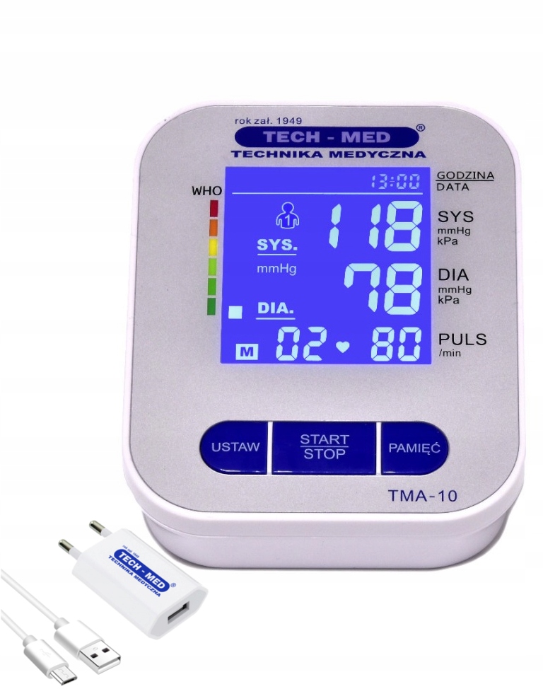 Тонометр TMA-10 TECH-MED — это современное, полностью автоматическое цифровое устройство с передовыми технологиями. Нажатие кнопки после наложения манжеты заставляет устройство измерять артериальное давление и частоту сердечных сокращений и отображать результаты на цифровом дисплее. ТМА-10 также обнаруживает симптомы аритмии. Эргономичный ЖК-дисплей обеспечивает легкое считывание результатов измерений.