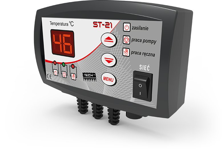 Регулятор СТ-21 со светодиодным дисплеем предназначен для управления циркуляционным насосом воды центрального отопления. Задача контроллера – включить насос при достижении температуры заданного значения и отключить его – если котел остынет ниже заданного значения на заданное значение гистерезиса. Этот режим работы предотвращает ненужную работу насоса, что экономит электроэнергию, а также продлевает срок службы насоса и повышает его надежность. Регулятор СТ-21 может также выполнять роль термостата, отключая насос после достижения заданной температуры. Контроллер также имеет функцию ANTISTOP, которая предотвращает остановку циркуляционного насоса вне сезона (насос включается примерно каждые 10 дней на 1 минуту). Дополнительной защитой является функция антизамерзания, которая предотвращает замерзание воды в установке, при падении температуры ниже 6°С насос включается постоянно).