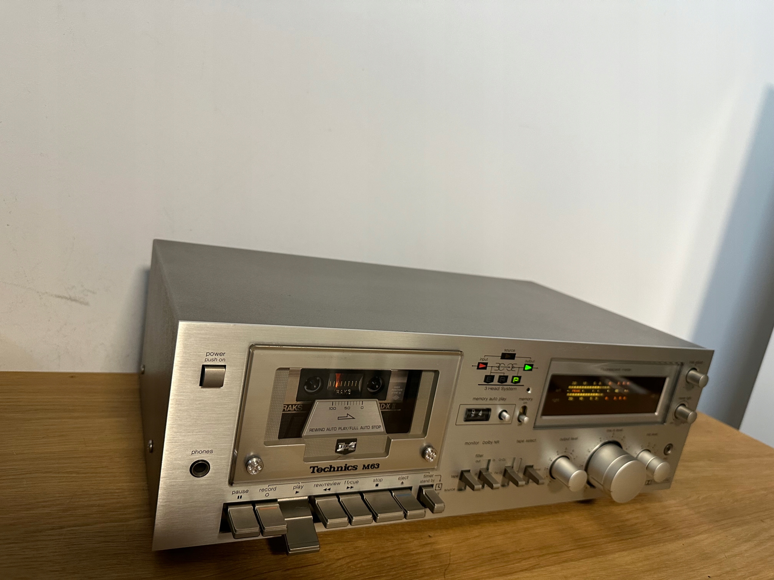 Техника Модель: RS-M63 Тип: Трехголовочный стереомагнитофон с задним управлением магнитофоном Год постройки: 1980 Производство: Осака, Япония Цвет: черный или серебристый Пульт дистанционного управления: Нет Потребляемая мощность: 14 Вт Размеры: ширина 430 мм, высота 142 мм, глубина 270 мм Вес: 6,3 кг Новая цена ок.: 700 DM Количество подключений: 3 Микрофон (гнездо 2x6,3 мм) (0,25 мВ/400 Ом - 10 кОм) LineIn (2xCinch) ( 60 мВ/56 кОм) DIN (0,25 мВ/8,2 кОм) Количество выходов: 3 Наушники (разъем 6,3 мм) (100 мВ/8 Ом) LineOut (2xCinch) (650 мВ/22 кОм или более) DIN (650 мВ/ 2,8 кОм) Технические данные Ленточные головки: система с 3 головками, 2 ленточные головки HPF, 1 двухщелевая передающая/ферритовая головка Двигатели: 1 двигатель постоянного тока с электронным управлением Джиттер синхронизации: 0, 05% (WRMS), +/- 0,14% (DIN) Типы лент: FE, FeCR, CrO2, лента из чистого железа Частотная характеристика: Нормальная полоса пропускания: 20–18 000 Гц, 30–17 000 Гц (DIN), 30–15 000 Гц (±3 дБ) Диапазон CrO2/FeCr: 20–18 000 Гц, 30–18 000 Гц (DIN), 30–16 000 Гц (±3 дБ) Диапазон чистого железа: 20–20 000 Гц, 30–18 000 Гц (DIN), 30–17 000 (±3 дБ), 40– 13 000 Гц (±3 дБ, 0 VU) Коэффициент искажения: Расстояние от внешнего напряжения (уровень сигнала = максимальный уровень обнаружения): Нормальная работа: 57 дБ Работа в формате Dolby: 67 дБ от 5 кГц Автоматический реверс: нет Поиск дорожки: нет, но Функция памяти Dolby: B Фильтр MPX: да Фейдер: нет Регулировка высоты тона: нет Синхронная запись компакт-дисков: нет Специальное оборудование Фронтальный загрузчик с тремя головками и контролем задней полосы Автостоп в конце линии Точная регулировка предварительного намагничивания с помощью циферблата Функция таймера (для записи с контролем по времени или воспроизведения по таймеру) Двухцветный флуоресцентный дисплей пикового уровня с регулируемой яркостью 5 светодиодов на передней панели предоставляют информацию о выходе источника программы, функциях воспроизведения, записи и удаления