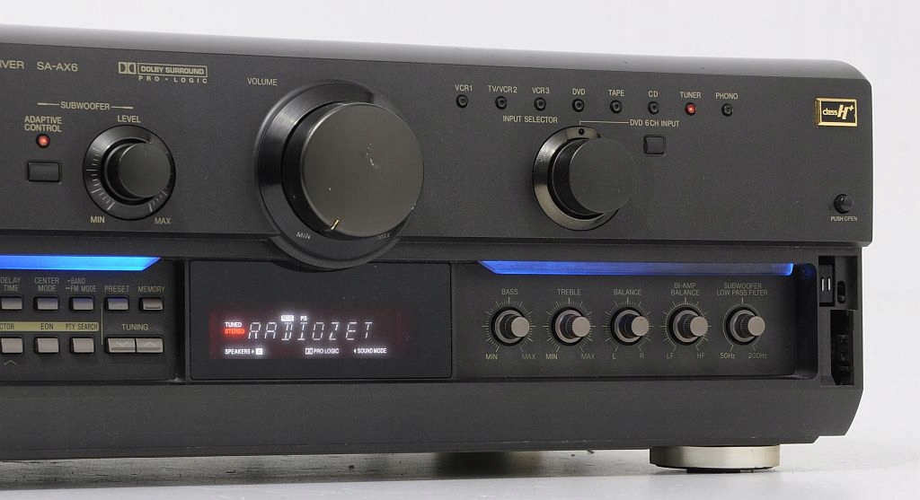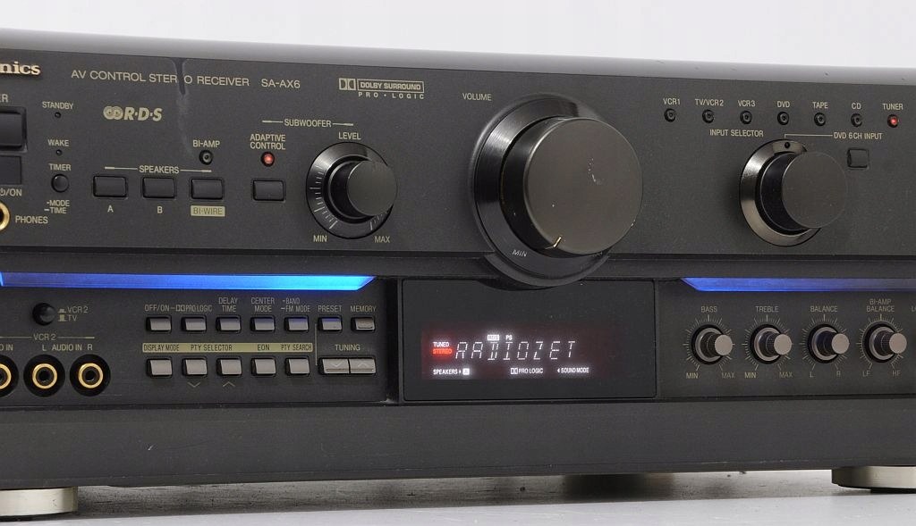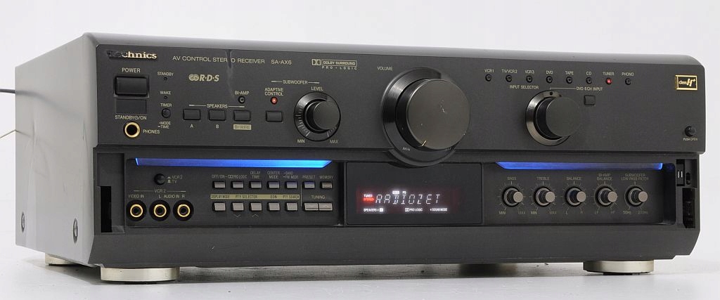 Technics SA-AX6-отличный мощный усилитель. Это модель на год старше AX7, и она отличается только тем, что концы мощности работают в H+ A в AX7 в VGCA. AX6 имеет встроенный в Dolby Prologice Decoder. Кроме того, в нем есть несколько определенных режимов звукового поле (Холл, Клуб, Живи, Театр, Сим Свлажка). Эта модель является одной из самых красивых технических конструкций. Его дизайн просто потрясающий. Визуальный эффект прекрасен благодаря синей подсветке. Таким образом, приемник даже привлекает внимание непрофессионала. Он построен на огромном тяжелом трансформаторе и больших конденсаторах. Благодаря использованию компонентов высокого класса оборудование обеспечивает невероятно сильный и чистый звук. Бас особенно отличается, благодаря которому после нажатия адаптивного режима невероятно силен и упругая. Самым большим преимуществом этого приемника является использование 6 кончиков питания для сабвуфера, усиление которого отдельно регулируется. Это позволяет подключить пассивный сабвуфер - намного дешевле. Цифровой радионнер с RDS (возможность программирования 30 станций). Имеет функции таймера (включен и выключение.)