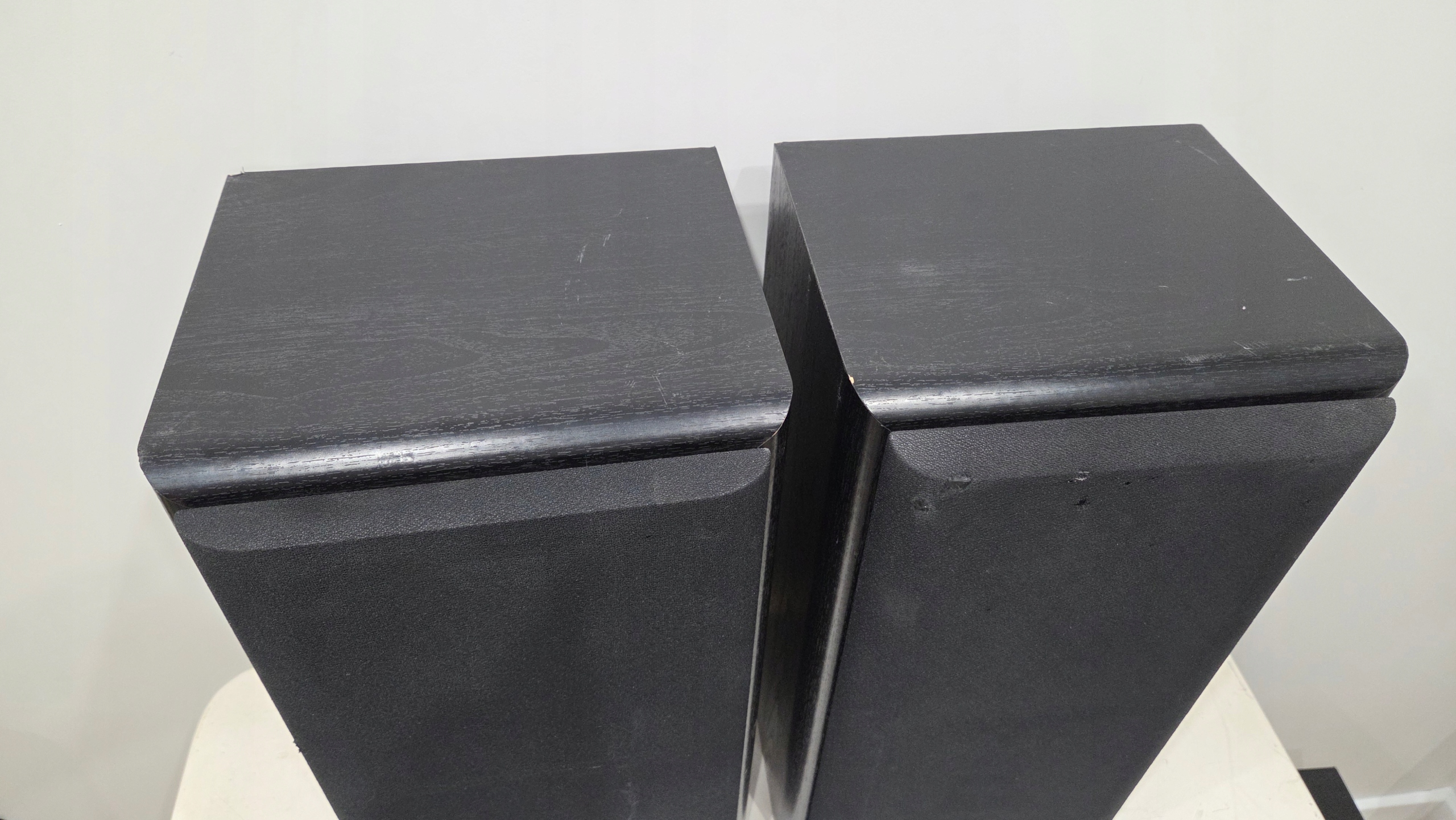 Столбцы на 100 % работоспособны. Визуальное состояние хорошее. На одной из решеток нет логотипа (видно на фото). Одна из обложек немного потерта (видно на фото). На корпусе небольшие царапины (видно на фото). В одной колонке на двух динамиках слегка помятая мембрана (видно на фото).