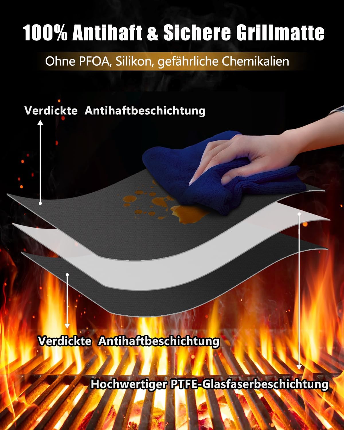 Одиночный тефлоновый мат имеет размер 40 х 33 см, а его толщина составляет всего 0,2 мм. Метод может быть получен меньшие тефлоновые срезы для использования при выпечке тортов и других блюд. Подушка из стекловолокна имеет высокое тепловое сопротивление, что делает ее безопасным в использовании. также работает в качестве горелки и решетки, защищая элементы от грязи от капающего жира.