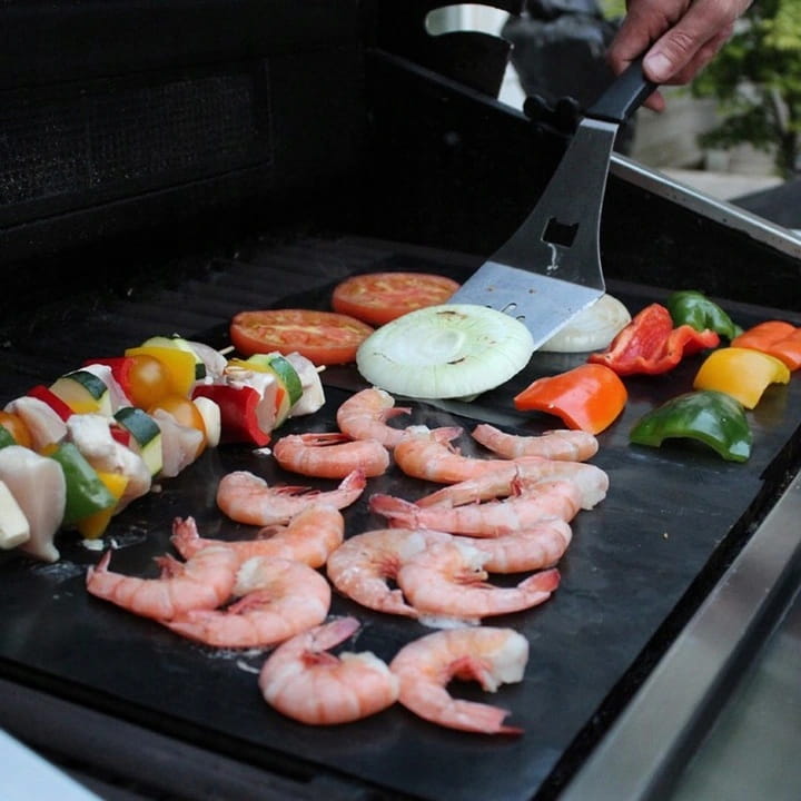 Тефлоновый коврик для гриля устойчив к высоким и низким температурам. Благодаря термостойкости до 260°C вы можете готовить на гриле, не опасаясь сжечь его или блюдо. Только не забудьте разместить решетку для жарки, на которую вы положите коврик, на высоте не менее 20 см над огнем.