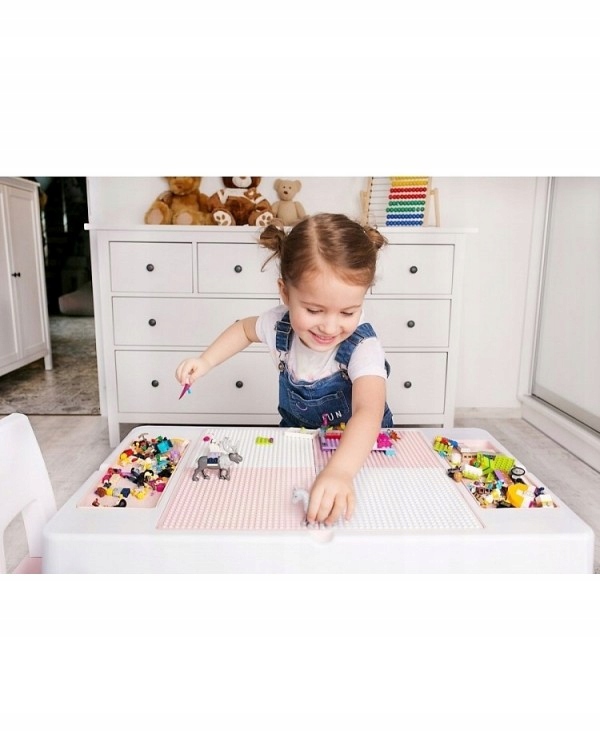 • Крышка большой столешницы двусторонняя: с одной стороны гладкая - для рисования, письма и росписи; с текстурой на другой стороне - становится доской, совместимой с блоками популярного бренда (блоки в комплект столешницы не входят).