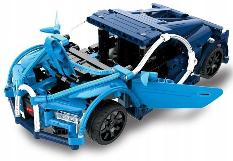 Набор состоит из 419 элементов и позволяет самостоятельно собрать дистанционно управляемый автомобиль. синий спортивный автомобиль. Автомобиль создан с особым вниманием к деталям, что обеспечит невероятное удовольствие. У автомобиля синийкузов с темно-синими элементами. В собранном виде автомобиль имеет открывающиеся двери и капот, а его руль вращается при управлении.