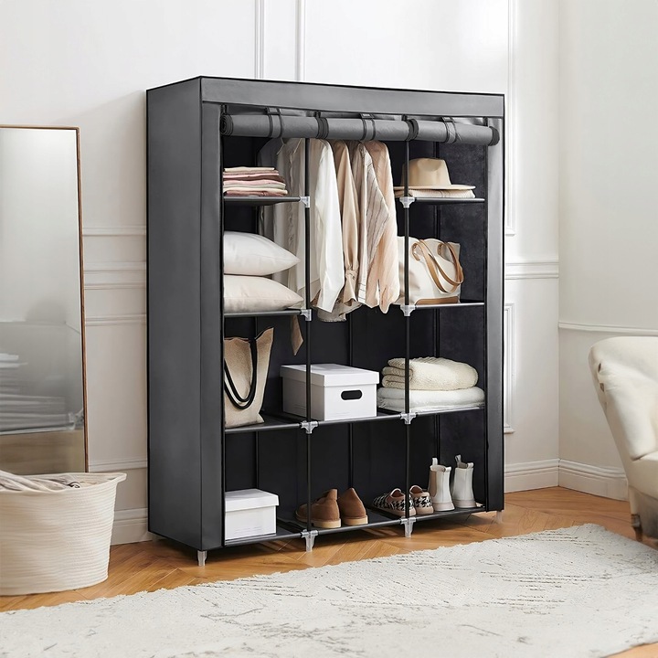 Шкаф построен на основе прочного металлического каркаса с качественными пластиковыми соединителями, что делает его прочным и быстрым в сборке - все за вас нужно несколько минут! Идеально подходит для переезда, путешествий или частой смены дома.