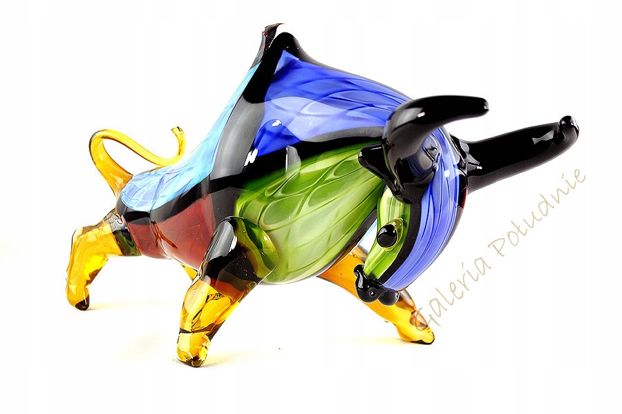 Большая стеклянная фигура изображает мощного быка, готового к атаке. Его голова наклонена вниз, обнажая сильные рога. Не случайно бык является символом силы, мужества, мужественности и власти. Это также может символизировать готовность преодолевать жизненные трудности. Американцы идентифицируют «силу и мощь своей нации» с фигурой быка. Под прозрачной стеклянной крышкой возникает пятицветная масса – синяя, темно-синяя, красная, зеленая и черная – напоминающая разноцветный витраж. Благодаря легким мазкам туловище животного кажется струящимся, создавая эффект лоскутного шитья. Утонченное сочетание придает фигуре небрежность и возвышенность, сочетает простоту с утонченным видением художника. Хвост быка образует золотую волну и напоминает капающую струю меда, что ассоциируется с процветанием. Сильные золотые ноги животного напоминают устойчивость, равновесие и твердую опору на земле. Черные как смоль рога и большие глаза быка привлекают внимание наблюдателя и идеально сочетаются с художественным туловищем.