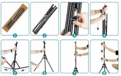 В комплект входит массивный студийный штатив, изготовленный из прочных материалов и с широкий диапазон регулировок. В сложенном (транспортном) виде его размеры составляют всего 68 см, а в сборном режиме штатив может работать в диапазоне 68-210 см. Штатив имеет нескользящие ножки, что делает его более устойчивым. Вместе со штативом пользователь получает специальную монтажную головку, соединяющую штатив с осветительным кольцом. Он позволяет регулировать наклон кольца относительно штатива в любую сторону.