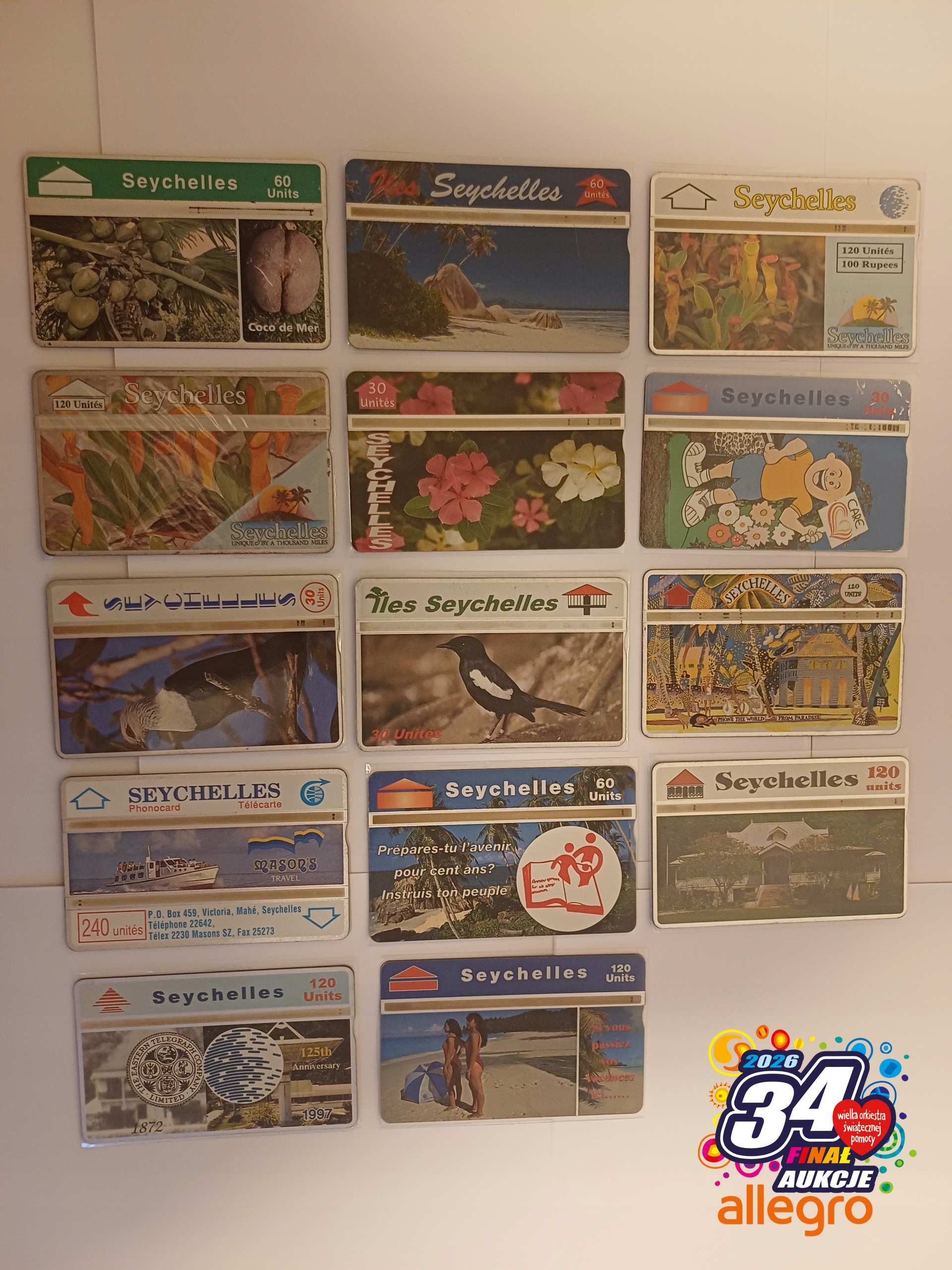 Телефонные карточки с Сейшельских островов, 14 шт. Состояние: царапины на аверсах двух карт, наклейки с каталожными номерами.