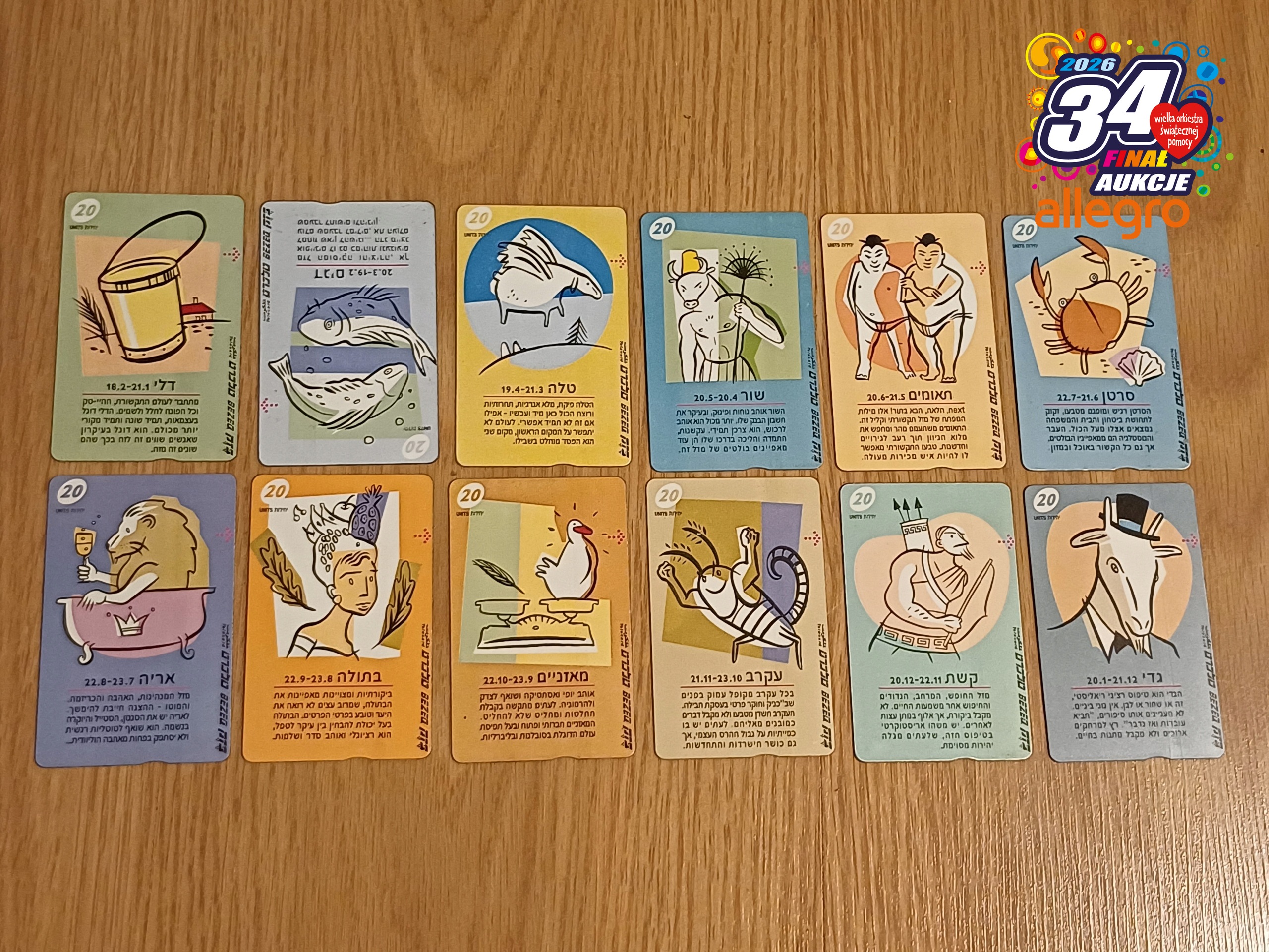 Телефонные карточки из Израиля - ЗНАКИ ЗОДИАКА, серия 12 штук. Состояние карт: царапины, на некоторых картах есть наклейки с каталожными номерами.