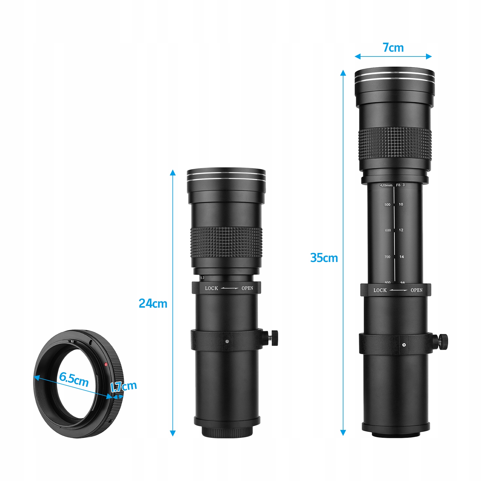 Супертелеобъектив с зумом: объектив обеспечивает ручную фокусировку при диафрагме F/8,3–16 и фокусном расстоянии 420–800 мм для отдельного управления суперзумом с зеркальных камер.