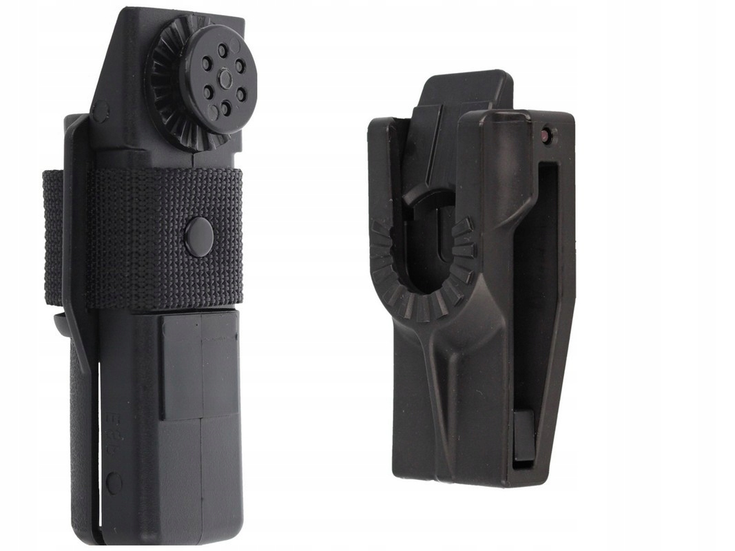 Кобура - запатентованная конструкция позволяет поворачивать ручку до упора. Поворот на 360° и фиксация в одном из 16 положений. Дубинку можно носить в сложенном или разложенном положении в вертикальном, горизонтальном или любом другом положении. Чехол изготовлен из прочного закаленного полипропилена.
