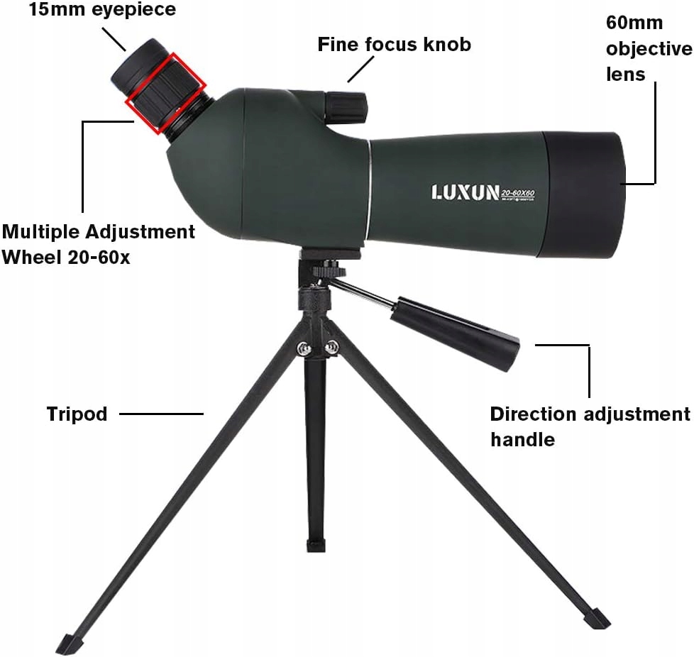 Обзорный телескоп LUXUN 20-60x60 — отличный выбор для любителей природы, орнитологов и людей, ищущих компактный и мощный телескоп для наблюдений на открытом воздухе. Благодаря переменному увеличению от 20x до 60x и объективу 60 мм он обеспечивает яркое, четкое и детальное изображение. Идеально подходит для наблюдения за птицами, пейзажами и для хобби.